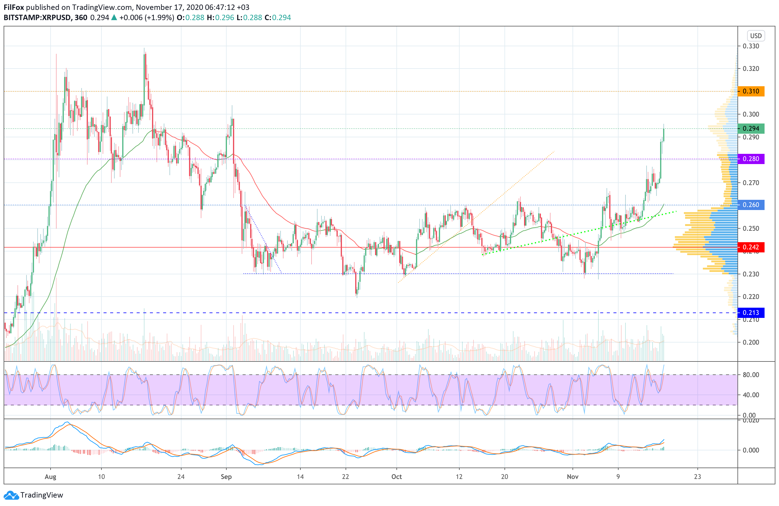 Вчера крупные покупатели поддержали рост цены Ripple и пробили сопротивление 0.280 USD. В конце дня рост продолжился и сегодня ночью пара обозначила месячный максимум в точке 0.296 USD.