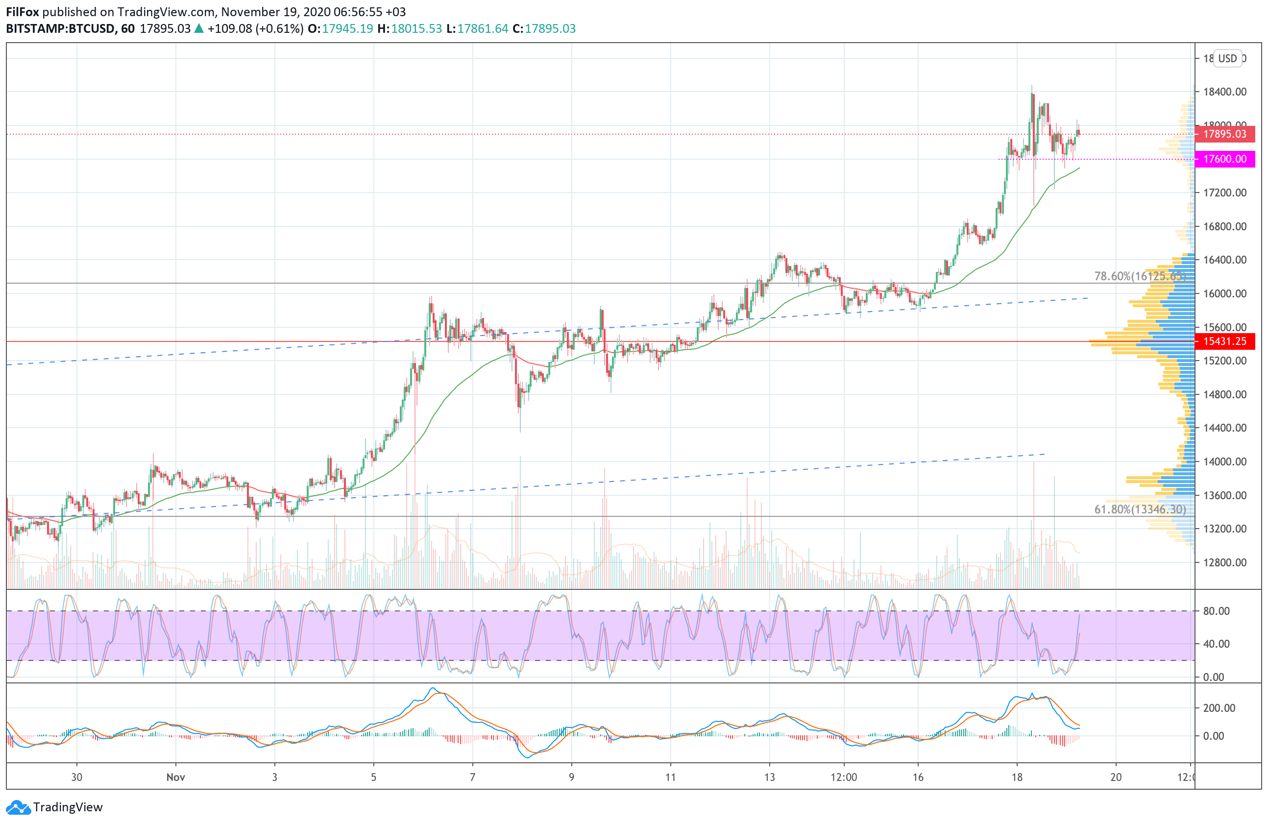Вчера утром, после обновления годового максимума в точке 18483.00 USD, цена биткоина откатилась ниже поддержки 17600.00 USD. Покупатели несколько раз восстанавливали пару в зону максимума, но довольно крупные продажи смогли свободно проколоть эту сильную поддержку.