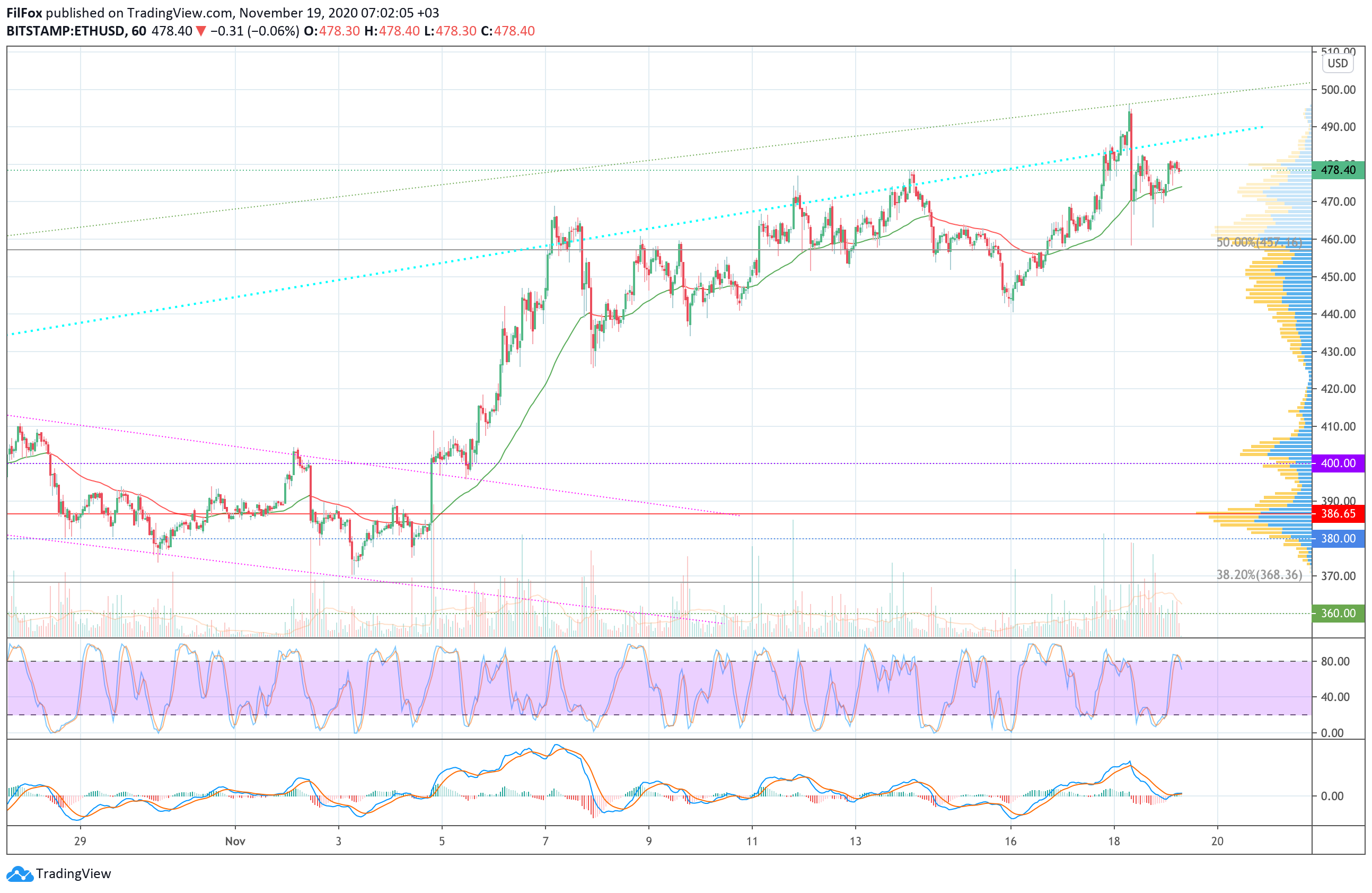 Вчера утром годовой максимум цены Ethereum был установлен в точке 496.00 USD, после чего медведи откатили цену ниже часовой EMA55, обозначив локальный минимум возле уровня 50% фибо (457.16 USD).