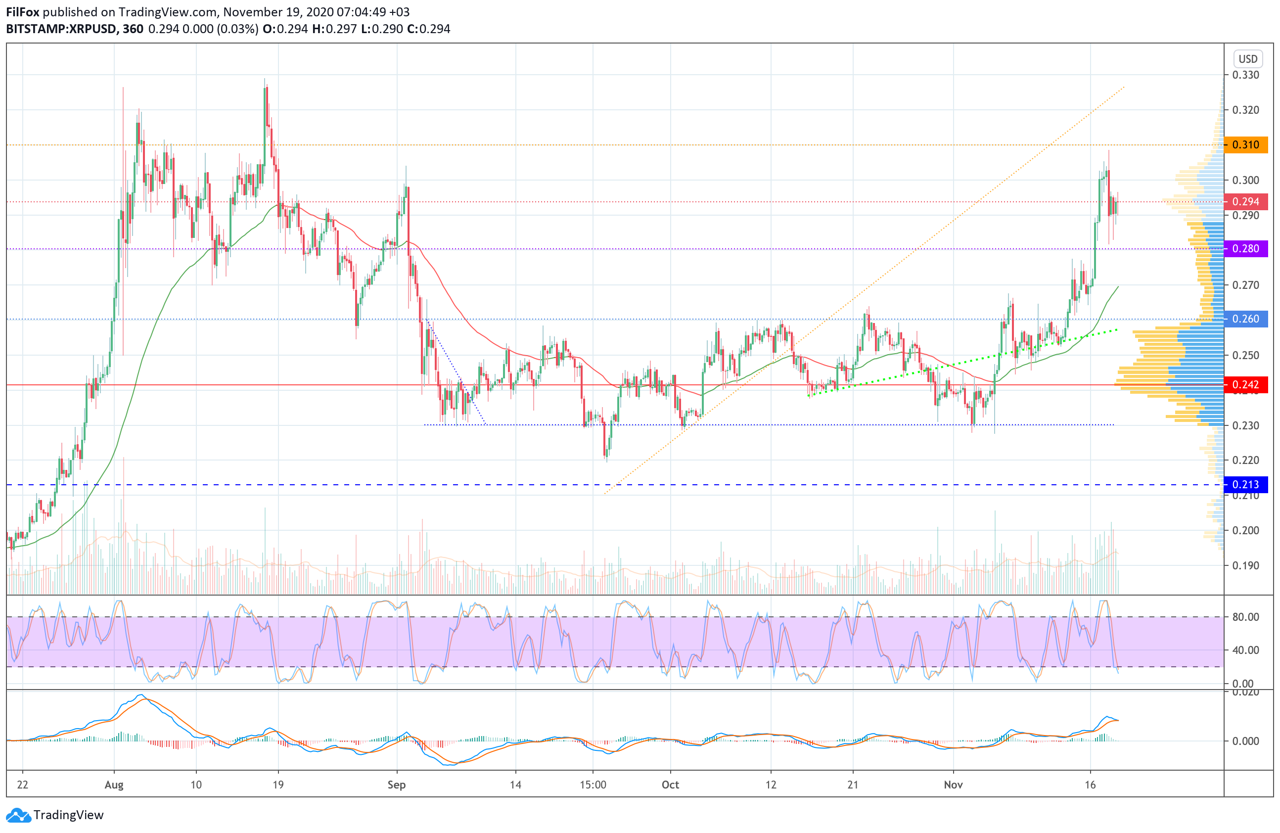 Вчера утром быки не смогли преодолеть сопротивление 0.310 USD, а крупные продажи отбросили цену Ripple из точки месячного максимума к поддержке 0.280 USD.