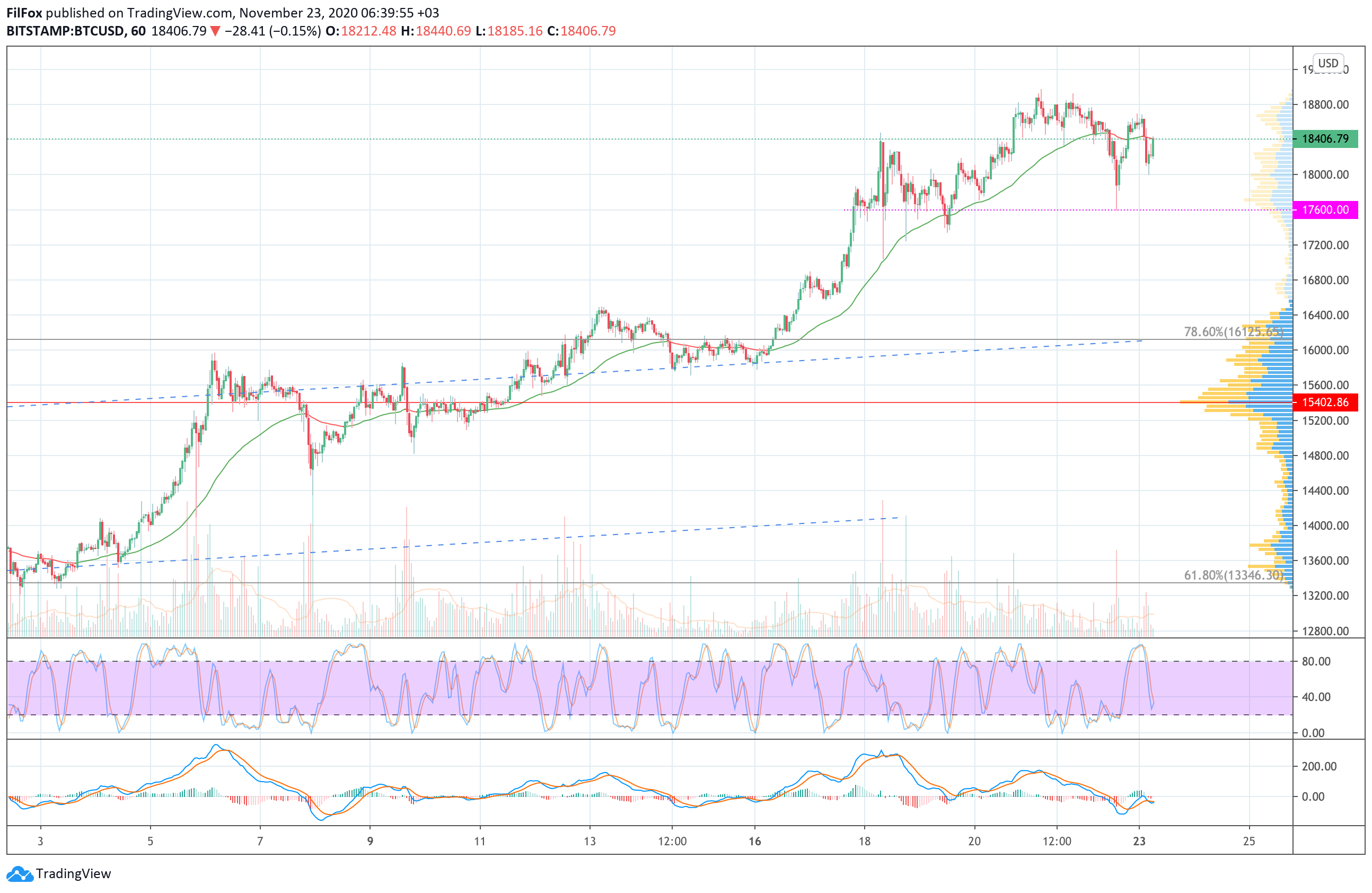 В минувшую субботу цена биткоина откатилась в район отметки 18500.00 USD, но этот уровень не смог удержать цену в консолидации и пара продолжила снижение.