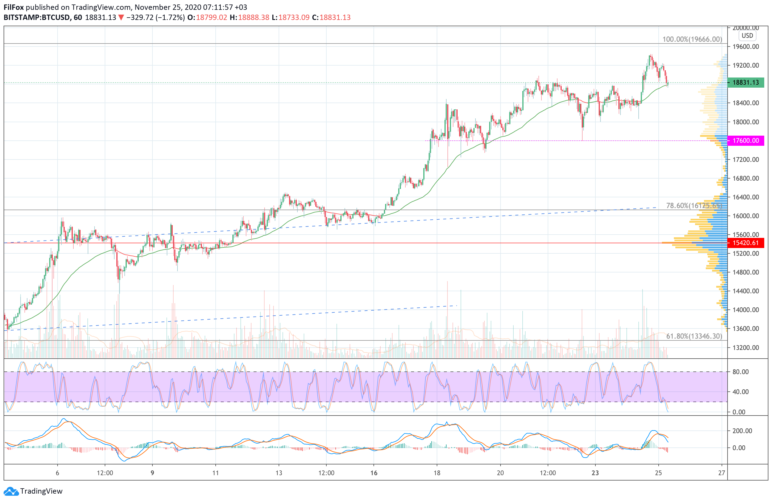 Вчера, в первой половине дня, покупатели нарастили объёмы покупок, и цена биткоина быстро восстановилась из области средних цен к сопротивлению 18800.00 USD. Быкам наконец-то удалось пройти зону годового максимума, установленного на минувших выходных, и обновить годовой рекорд до отметки 19416.00 USD.