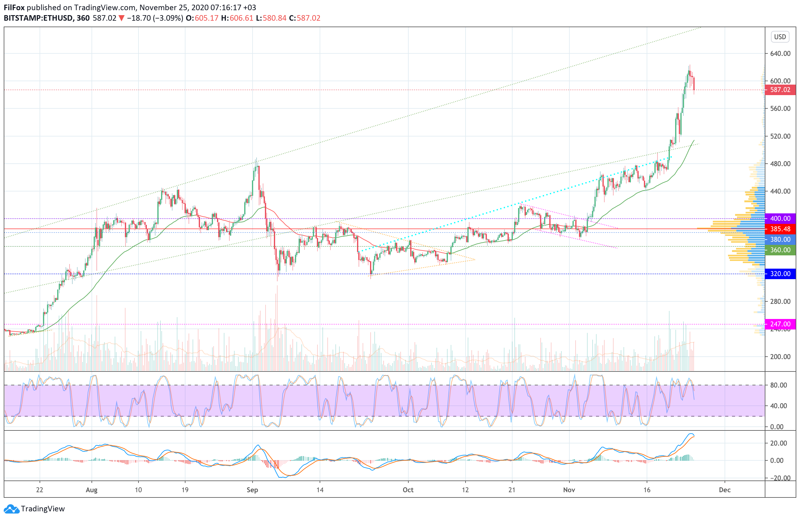 После ре-теста уровня 620.00 USD, цена Ethereum установила новый годовой максимум в районе отметки 624.00 USD и развернулась в откат.