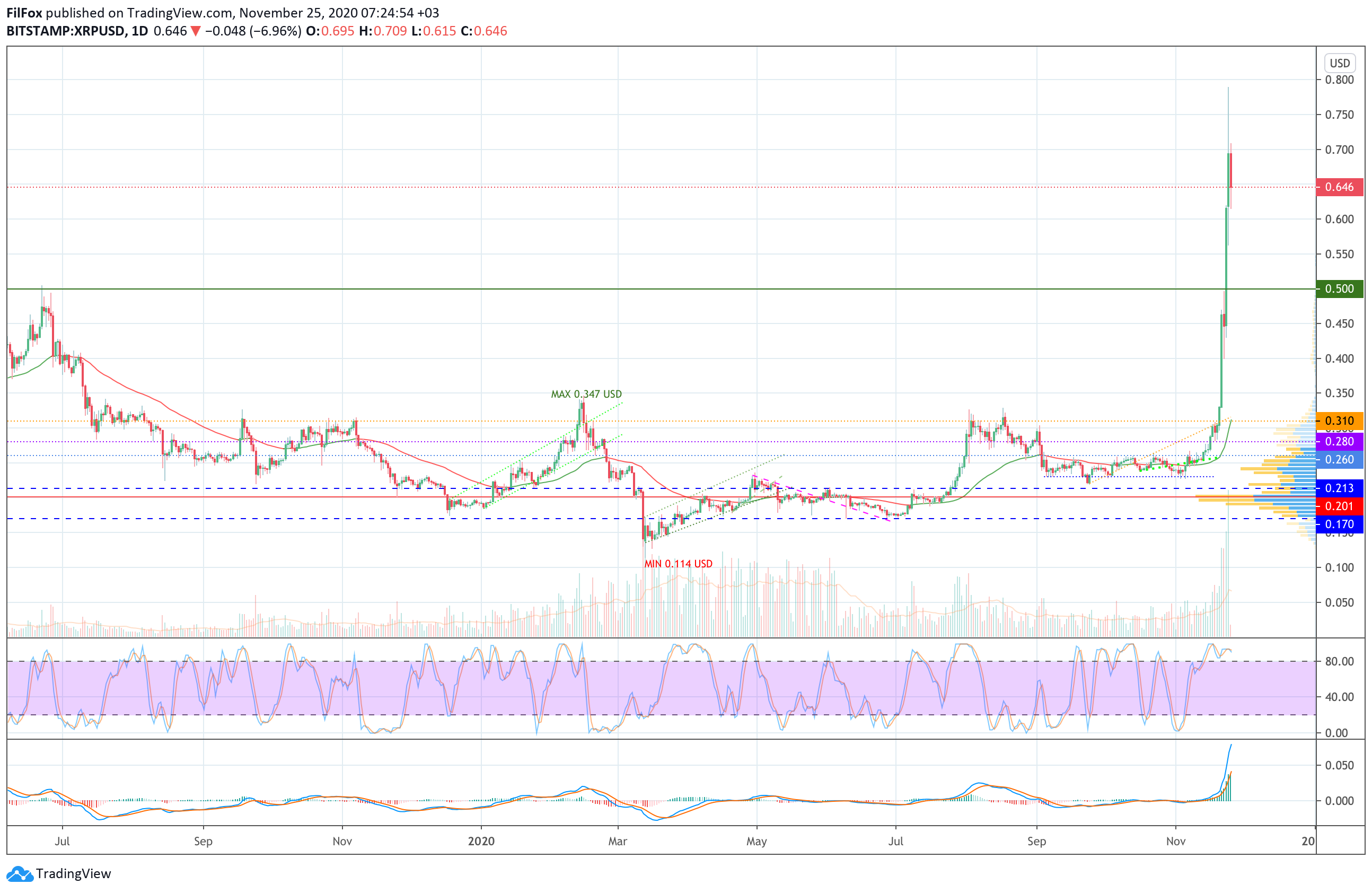 Вчера утром быки продолжили тащить цену Ripple в область нового максимума и зафиксировали годовой рекорд на отметке 0.790 USD.