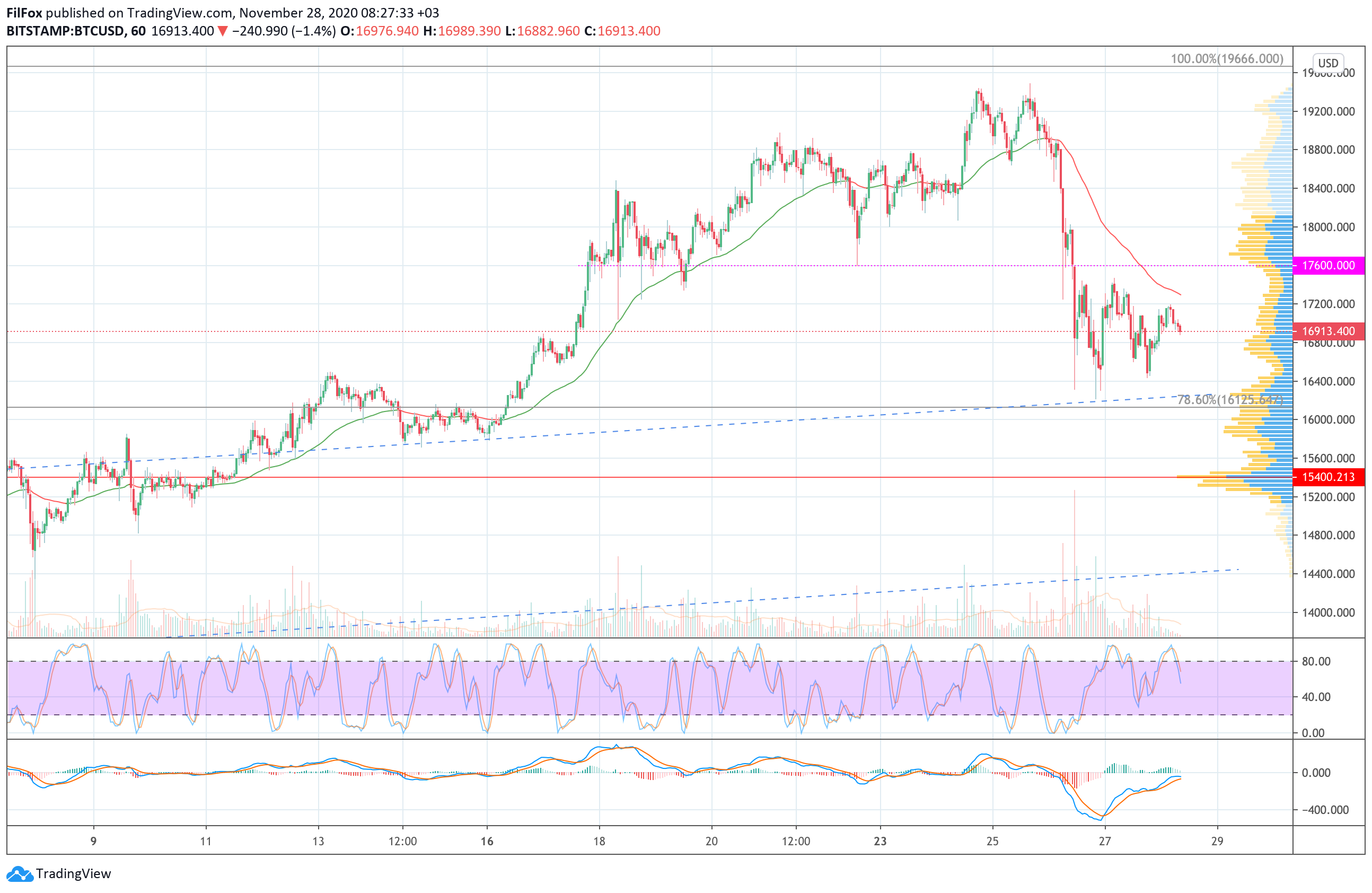 К завершению дня объёмы торгов сократились, и пара стабилизировалась в районе отметки 16900.00 USD. На этой неделе цена Bitcoin упала более чем на 16%, а капитализация криптовалютного флагмана сократилась на $37 млрд.