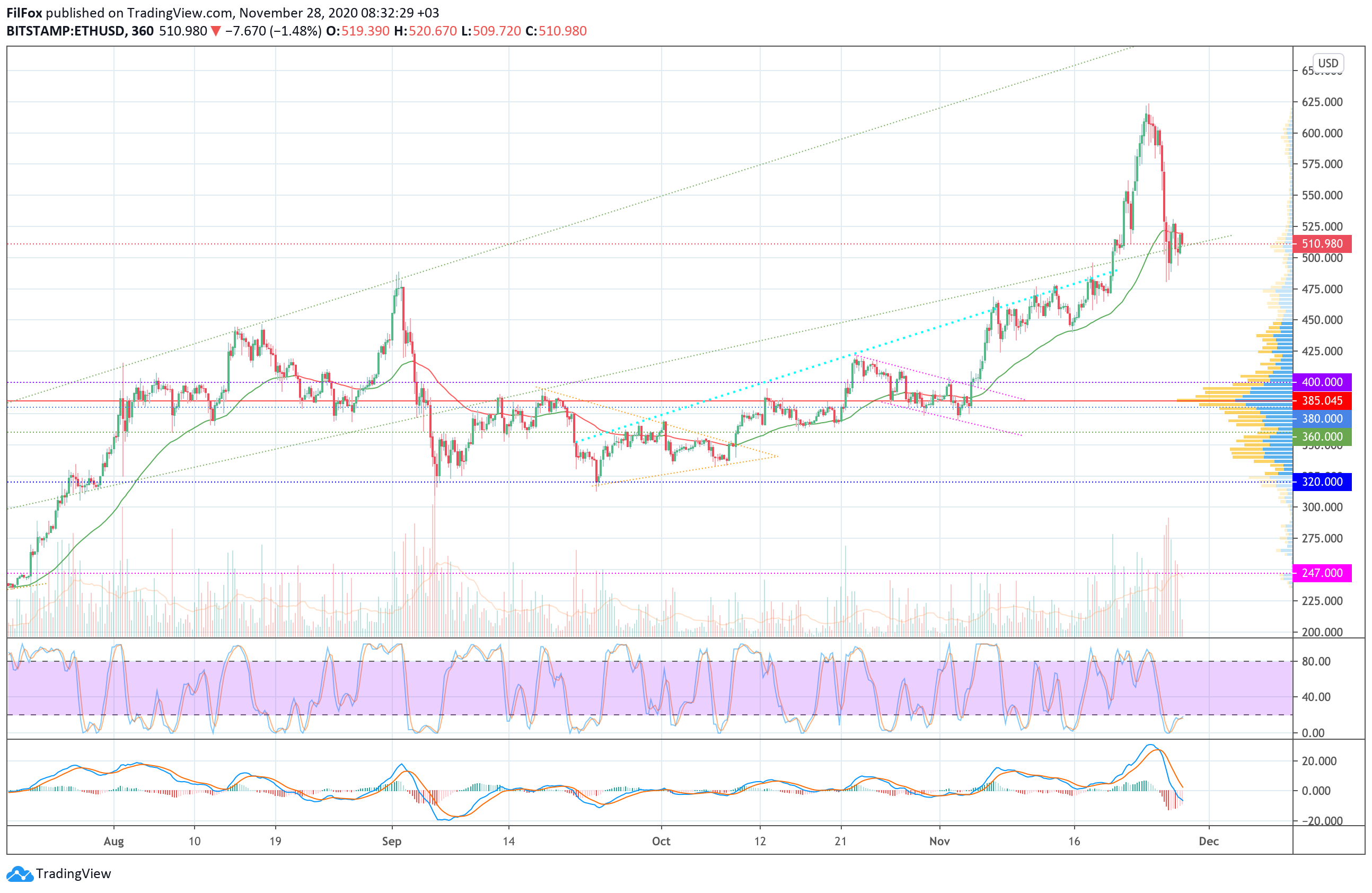 Если на выходных медведи продавят поддержку линии тренда, то пара откатится в район отметки 450.00 USD, а если объёмы покупок начнут расти, то восстановление возможно в область 550.00 USD.