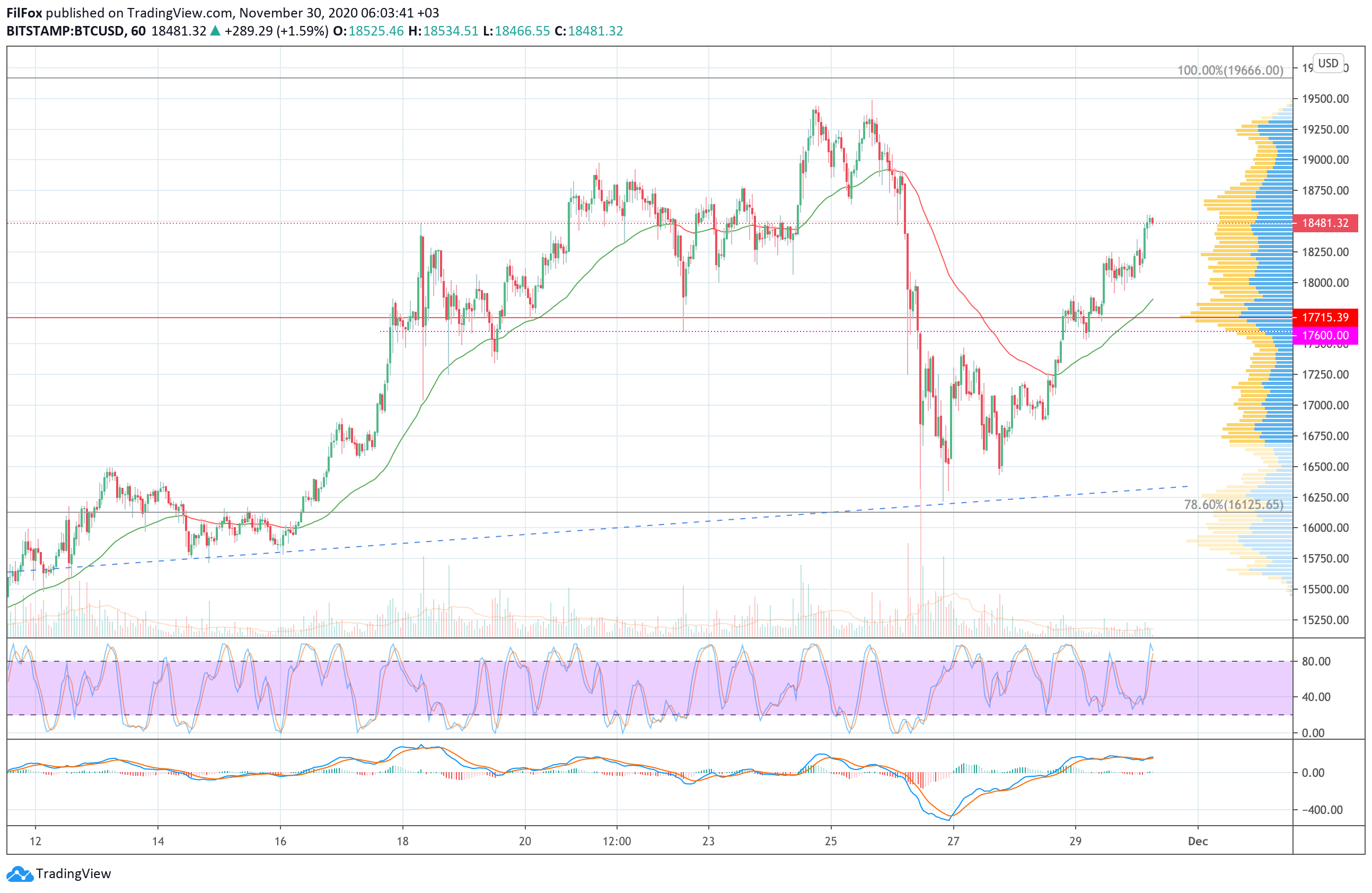 Сегодня ночью объёмы покупок сохранились низкими, но цена, как ни странно, продолжила восхождение и на утро достигла отметки 18500.00 USD. Короткий откат вернёт пару в область часовой скользящей средней EMA55, а если медведи устроят активные распродажи, то уровень средних цен не удержит пару от снижения и продавцы откатят цену в область 16000.00 USD.