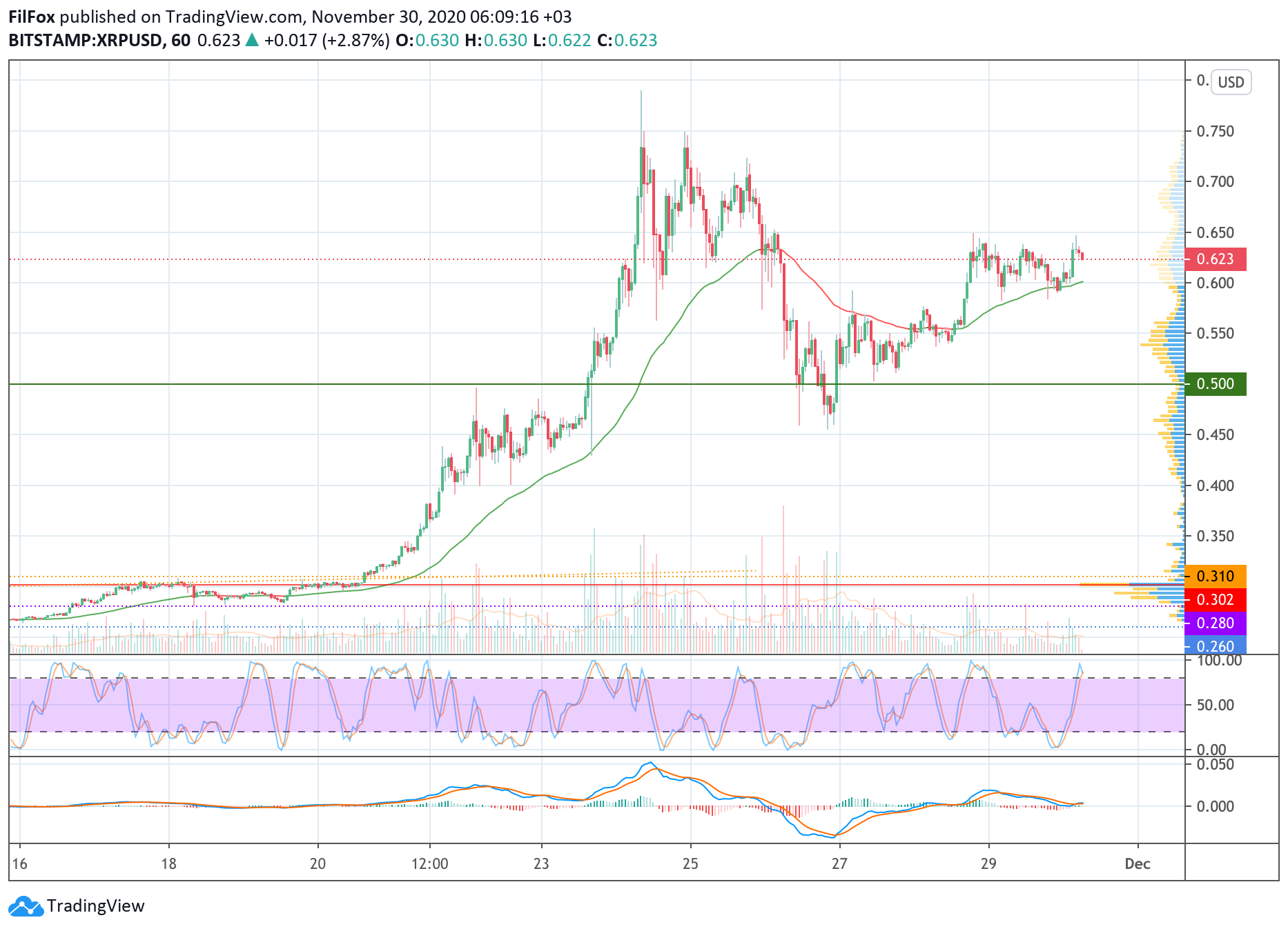 В прошедшую субботу цена Ripple закрепилась в районе часовой EMA55. Во второй половине дня наблюдался небольшой всплеск по объёмам, который привёл к прорыву выше отметки 0.600 USD.