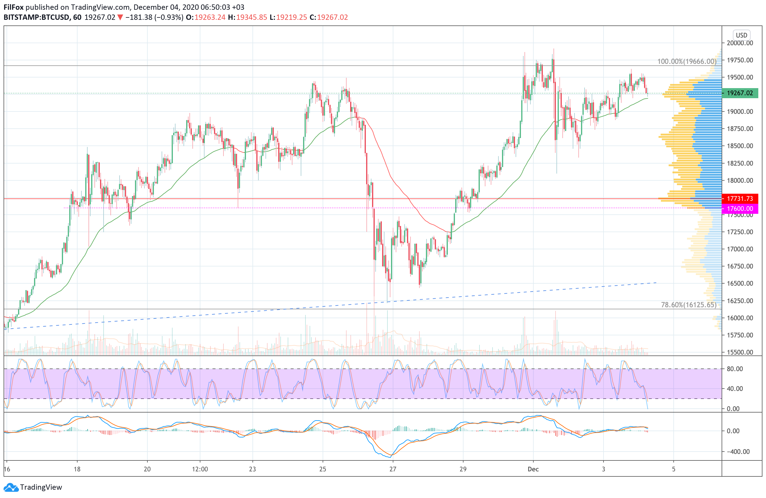 В течение дня рост цены BTC не был поддержан крупными объёмами. Активность покупателей не превышала средний уровень, и дневной максимум удалось установить только в районе отметки 19620.00 USD, а протестировать стопроцентный уровень фибоначчи так и не получилось.