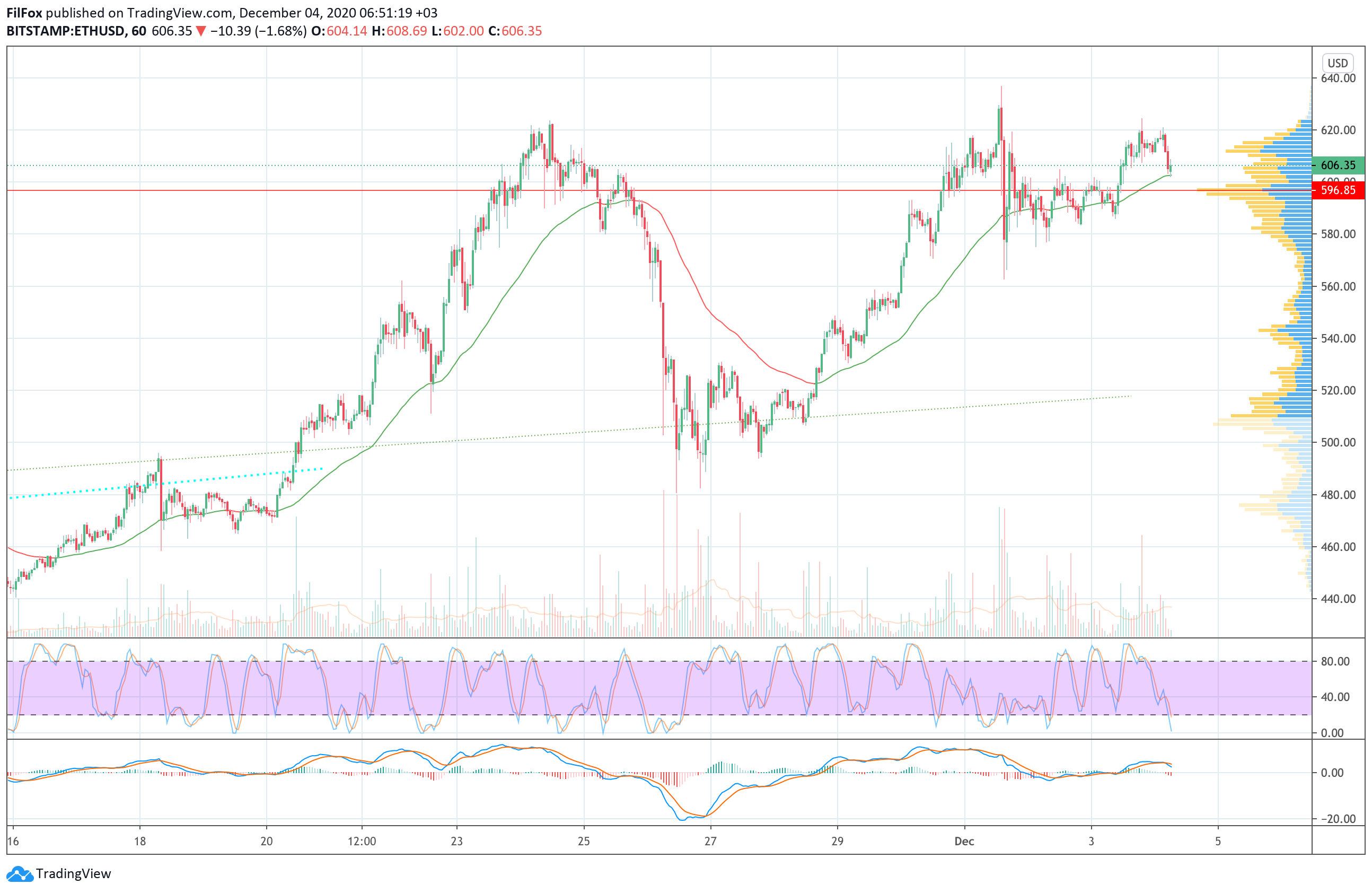 Вчера покупатели не смогли преодолеть сопротивление на уровне 620.00 USD и на сегодняшнее утро цена Ethereum вернулась в область средних цен.