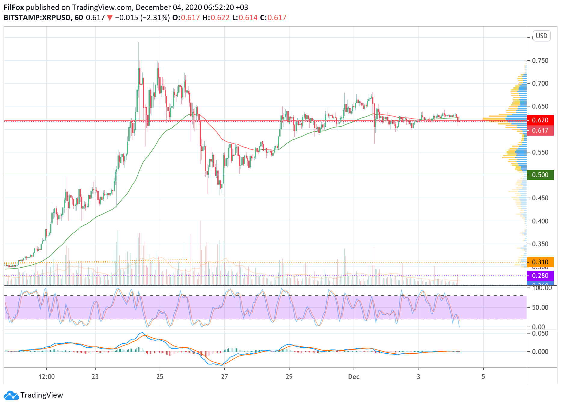 Вчера быки не смогли нарастить объёмы покупок и цена Ripple весь день провела в консолидации, в узком боковом коридоре выше линии POC (0.619 USD).