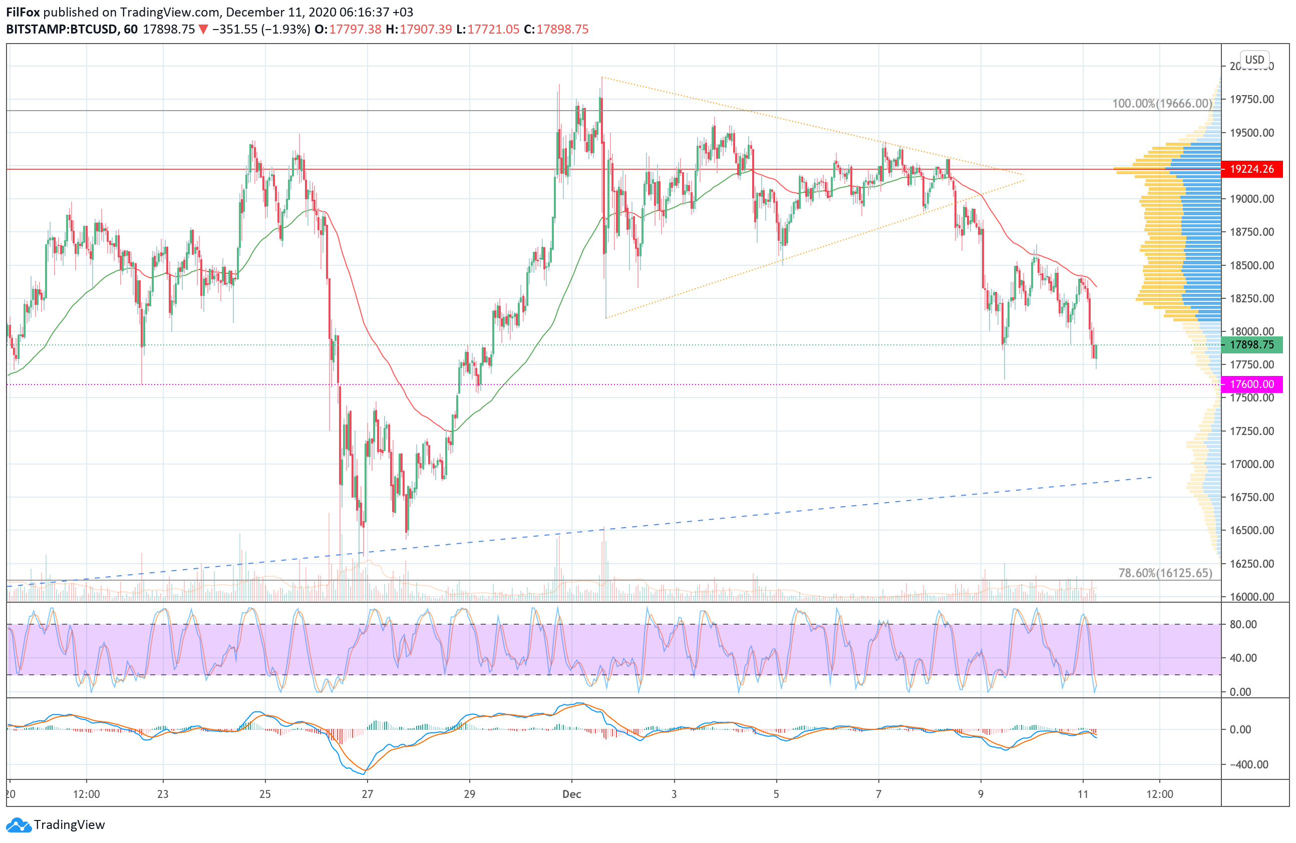 Если же медведи продавят сильный уровень поддержки 17600.00 USD, то на выходных пара откатится к восходящей синей линии тренда (в район 17000.00 USD).