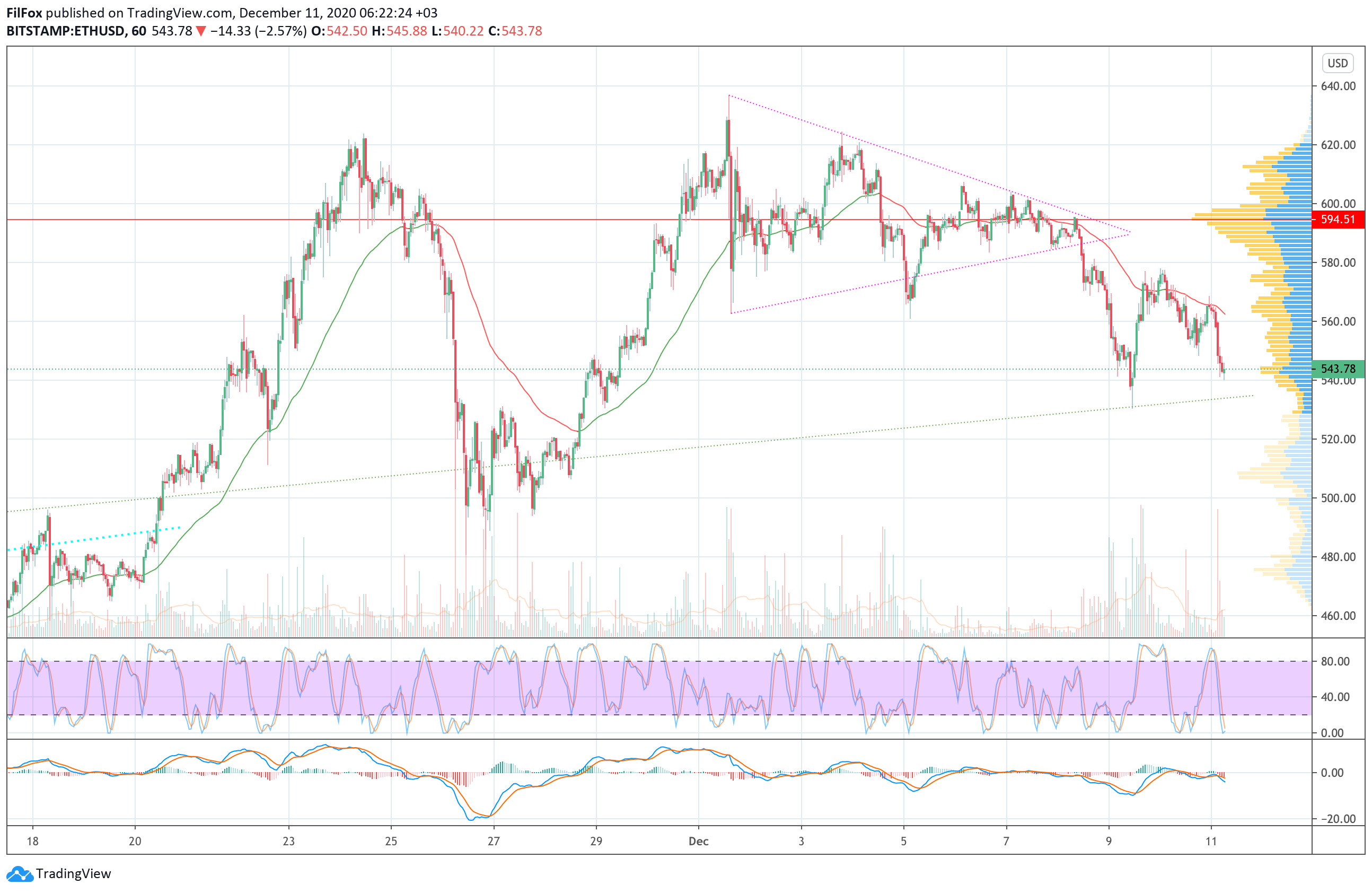 Вчера утром продавцы оттеснили цену Ethereum от часовой EMA55. Вечером покупатели предприняли отчаянную попытку проколоть кривую скользящей средней EMA55, но в завершении дня мощный медвежий импульс вернул пару к поддержке 540.00 USD. Если этот уровень не удержит натиск продавцов, то снижение может продолжиться к зелёной линии тренда.
