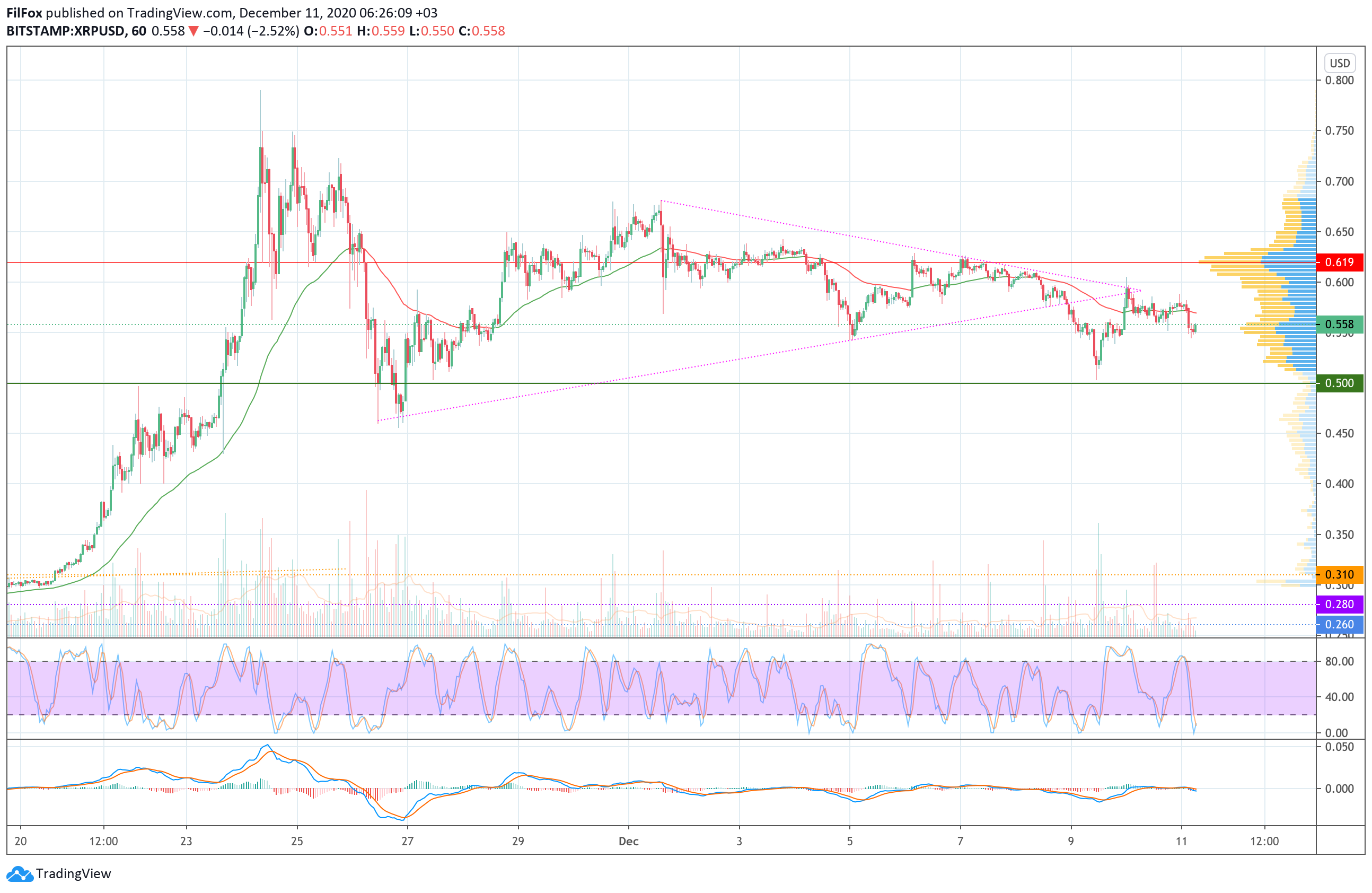 Вчера, в течение дня, цена Ripple консолидировалась в области часовой EMA55. Сегодня ночью давление медведей усилилось и продавцы оттеснили цену к поддержке 0.540 USD.
