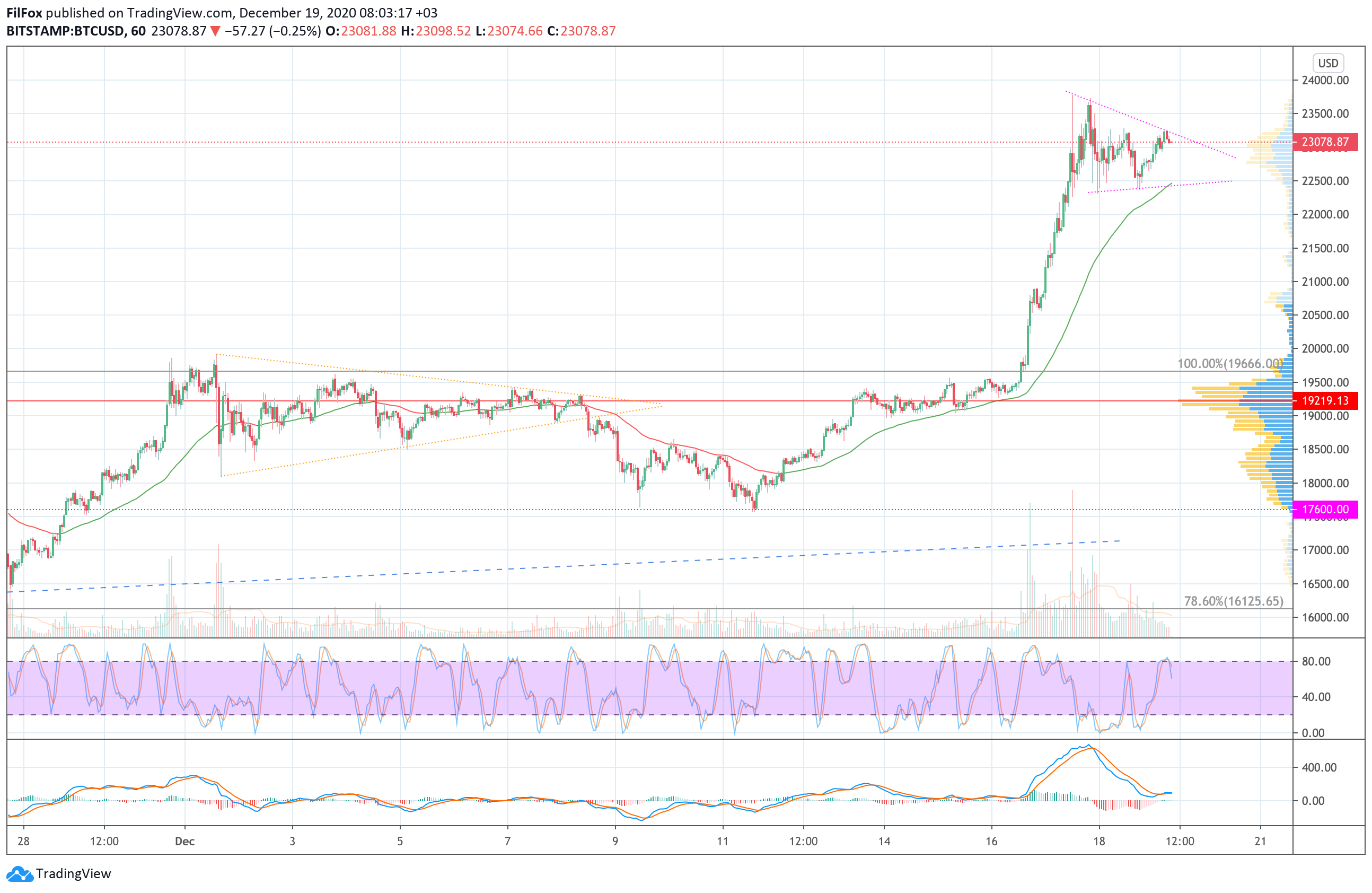 До конца недели цена BTC может покинуть боковой коридор, продолжив рост в район отметки 25000.00 USD.
