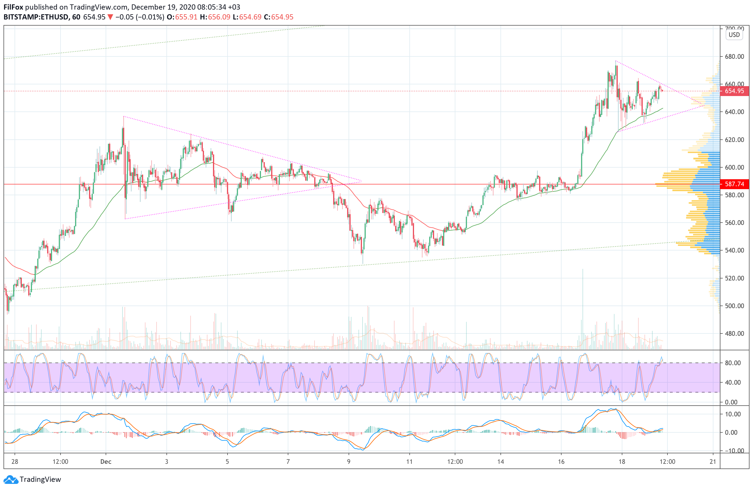 Цена эфира тоже приостановила рост, и вчера, в течение всего дня, консолидировалась в пределах фиолетового треугольника.