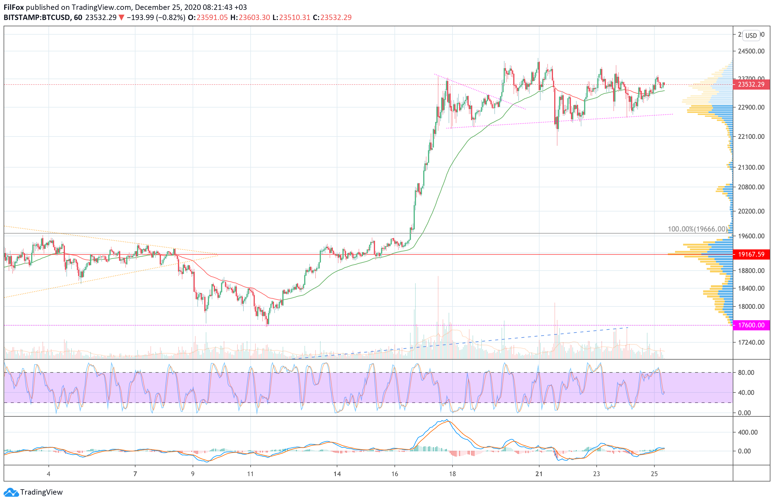 Если попытки будут поддержаны крупными объёмами, то до конца недели цена может обновить исторический максимум в районе отметки 25000.00 USD.