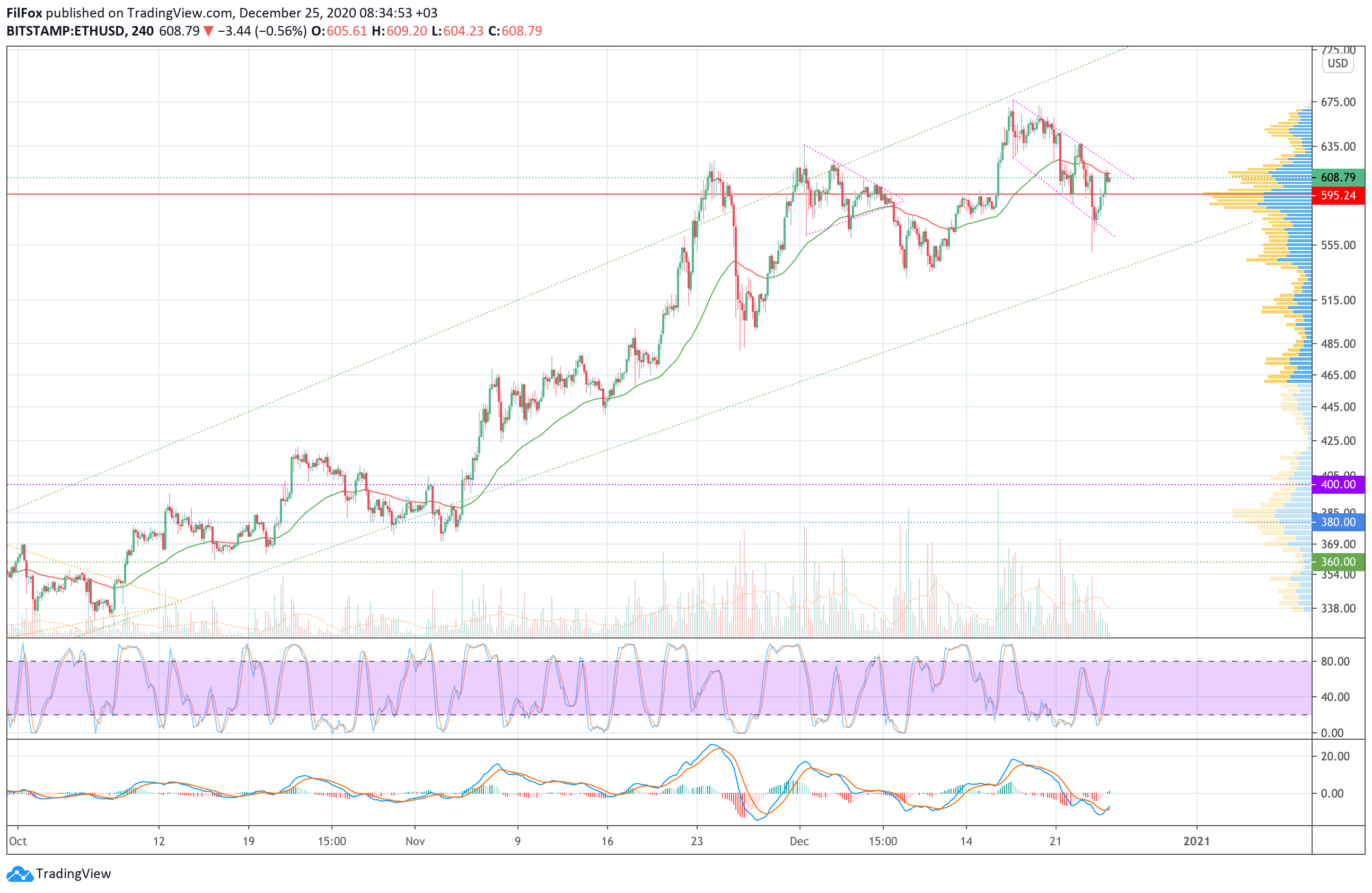 После месячного минимума в точке 550.00 USD, цена эфира существенно восстановилась и достигла среднего уровня.