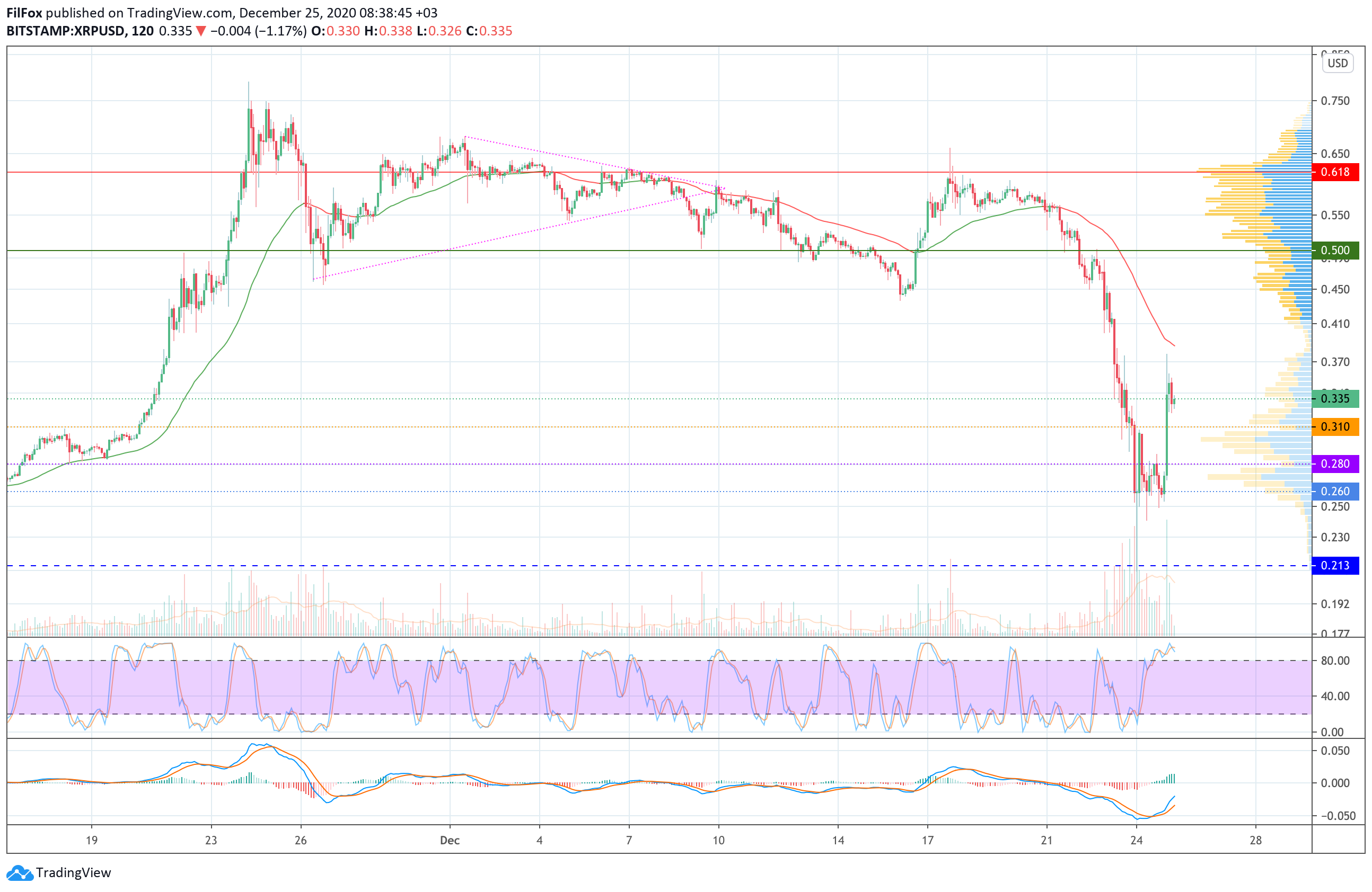 На уровне 0.260 USD покупатели нащупали поддержку и попытались восстановить пару в область средних цен. Сегодня ночью мощный бычий импульс пробил сопротивление 0.310 USD, но протестировать двухчасовую скользящую среднюю пока не получается.