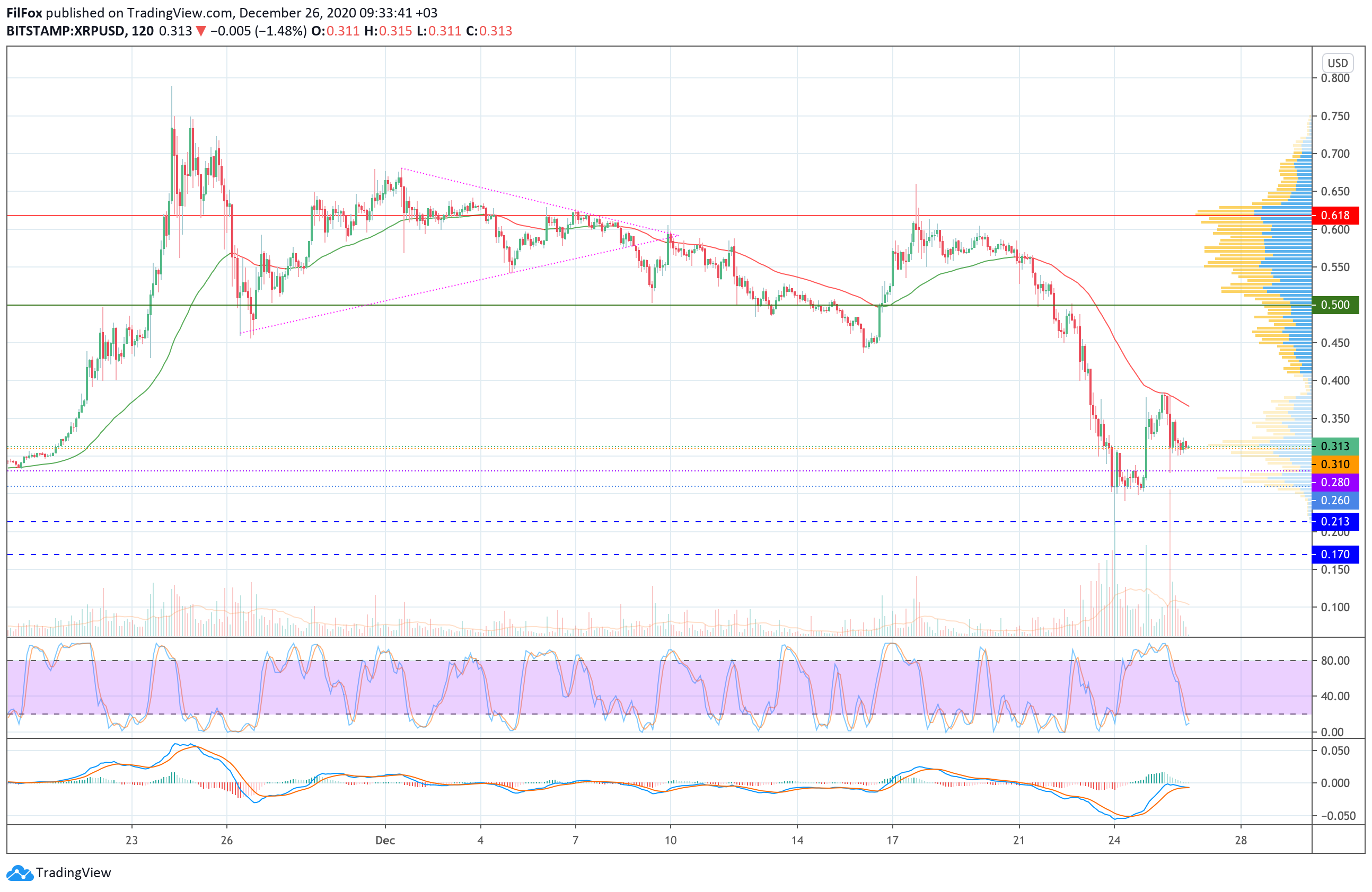 Вчера, в первой половине дня цена XRP пыталась продолжить восстановление, но двухчасовая EMA55 ограничила рост пары. Ре-тест этой скользящей средней спровоцировал мощную волну продаж, которая отбросила цену к поддержке 0.280 USD. После этого объёмы продаж сократились и цена стабилизировалась чуть выше уровня 0.310 USD.