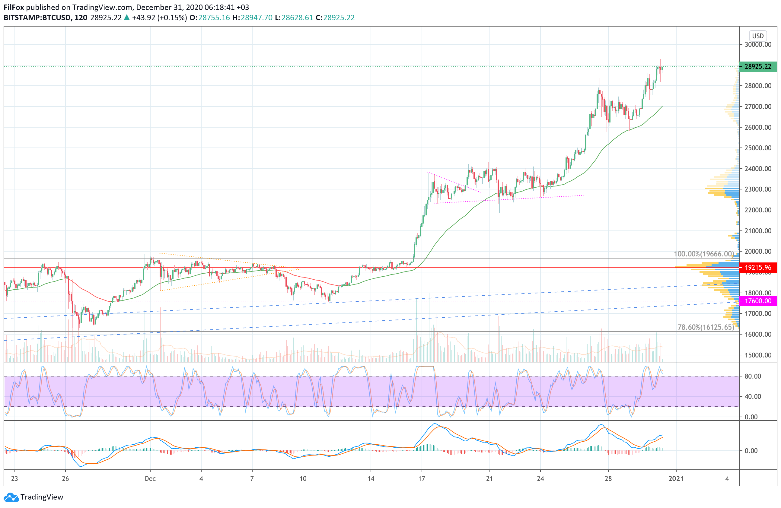 Вчера быки продолжили забег и до конца дня цена биткоина смогла протестировать отметку 29000.00 USD. Ночью пара установила абсолютный рекорд в точке 29300.00 USD, а на сегодняшнее утро немного откатилась из зоны максимума.