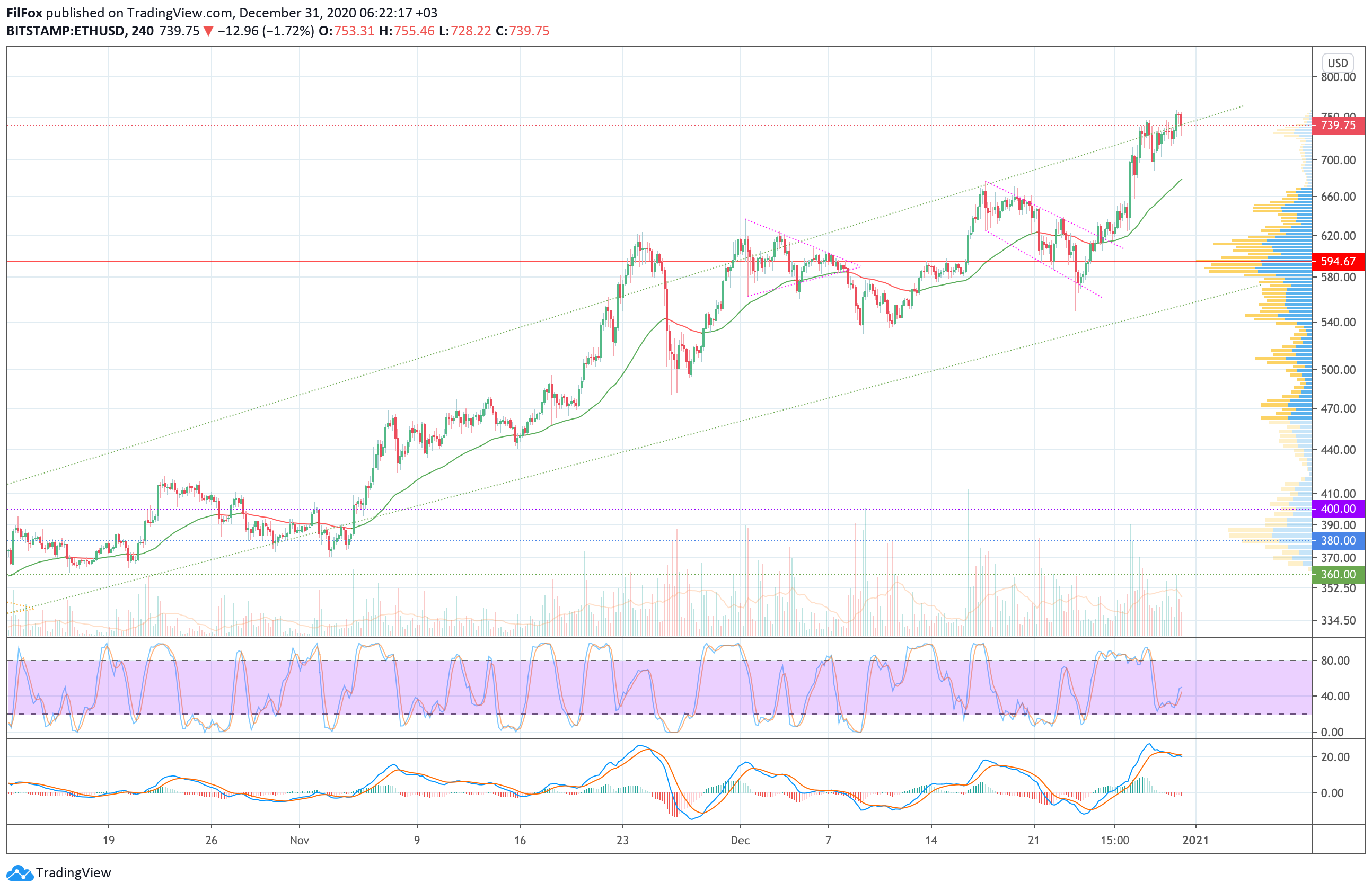 Ночью пара обозначила новый годовой максимум в районе отметки 758.00 USD, но продавцы вернули цену эфира в пределы восходящего коридора. Если покупатели справятся с мощным сопротивлением верхней границы канала, то до конца 2020 года цена ETH протестирует психологическую отметку 800.00 USD.