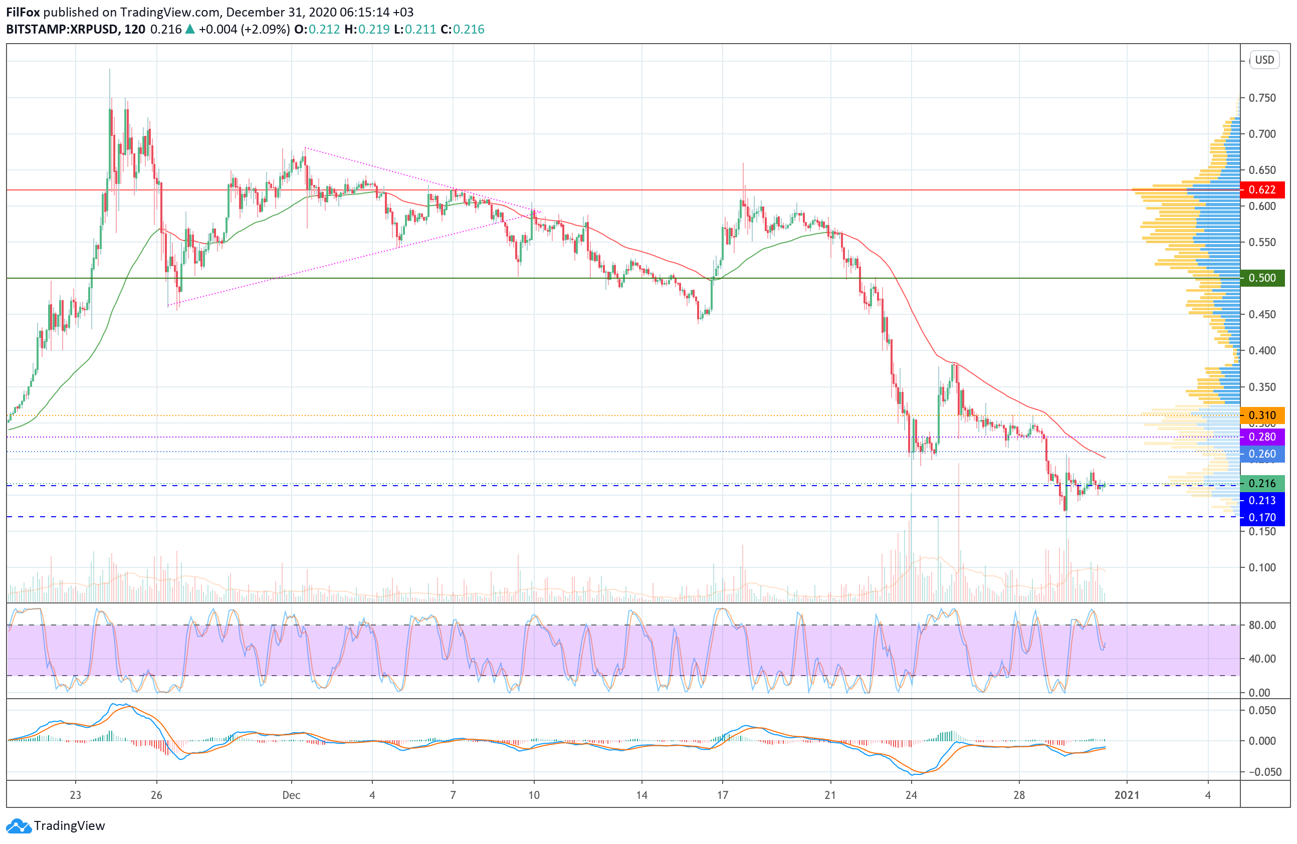 Вчера продавцы попытались оттеснить цену Ripple к нижней границе синего коридора, но пара смогла удержаться в районе уровня 0.213 USD.