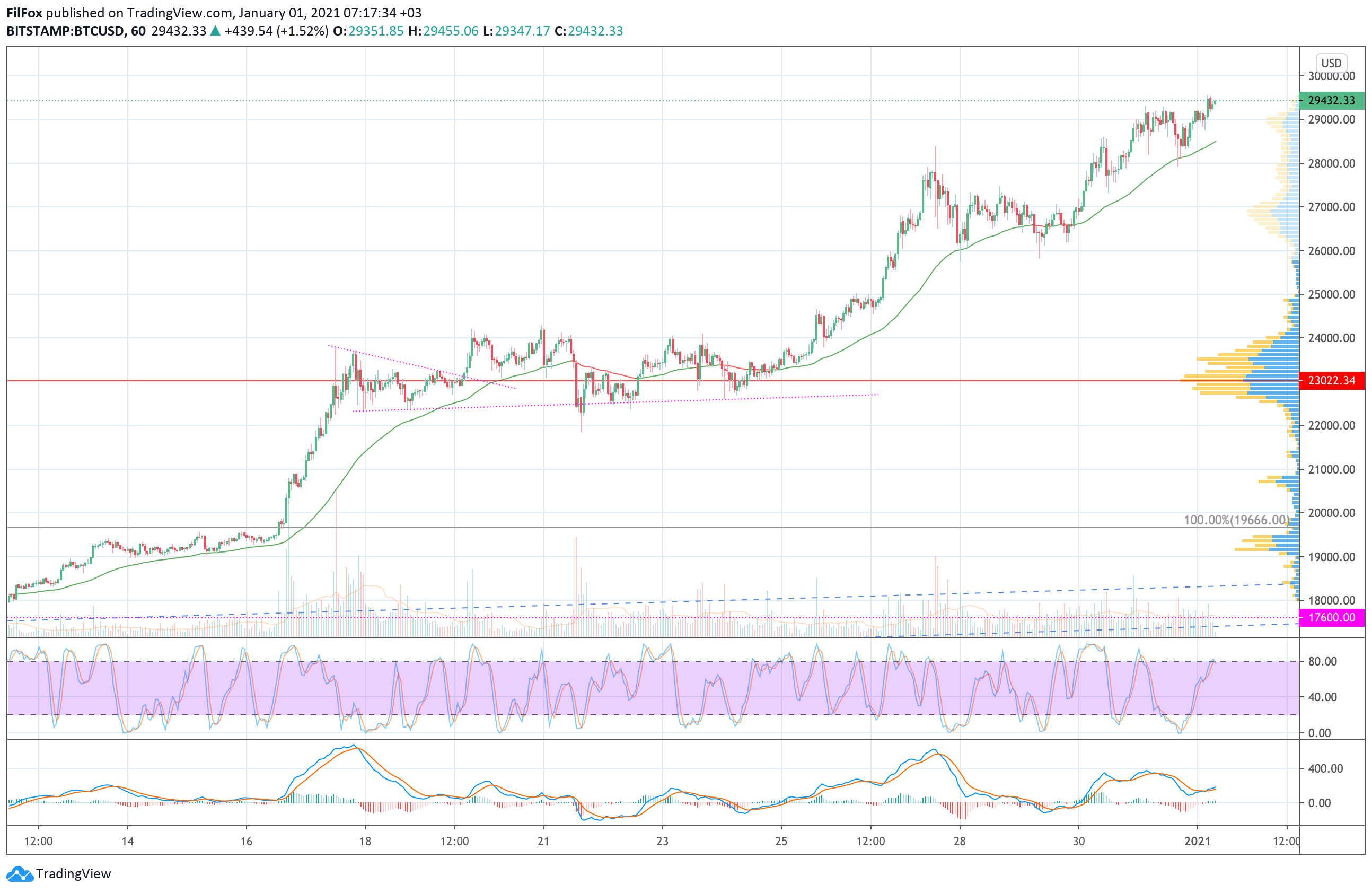 Вчера максимум 2020 года устоял на отметке 29300.00 USD. Однако, в первый день нового года бычий забег продолжился и Bitcoin обновил абсолютный максимум.