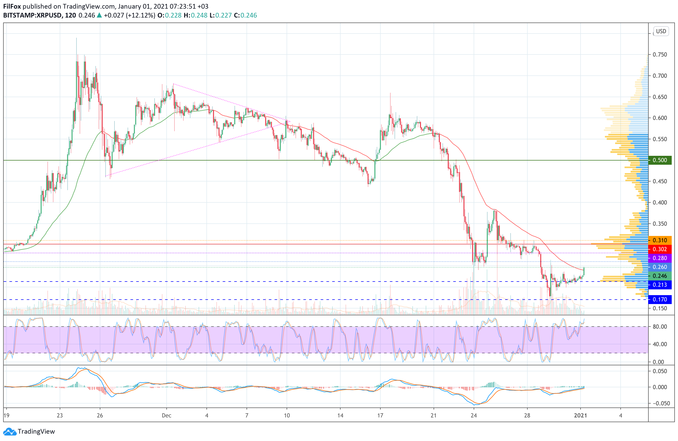 Сегодня утром покупатели предприняли попытку восстановиться в область средних цен, и пара протестировала двухчасовую скользящую среднюю EMA55. Если покупатели смогут поддержать положительную динамику, то до конца недели цена может закрепиться в диапазоне $0.280 - $0.310.