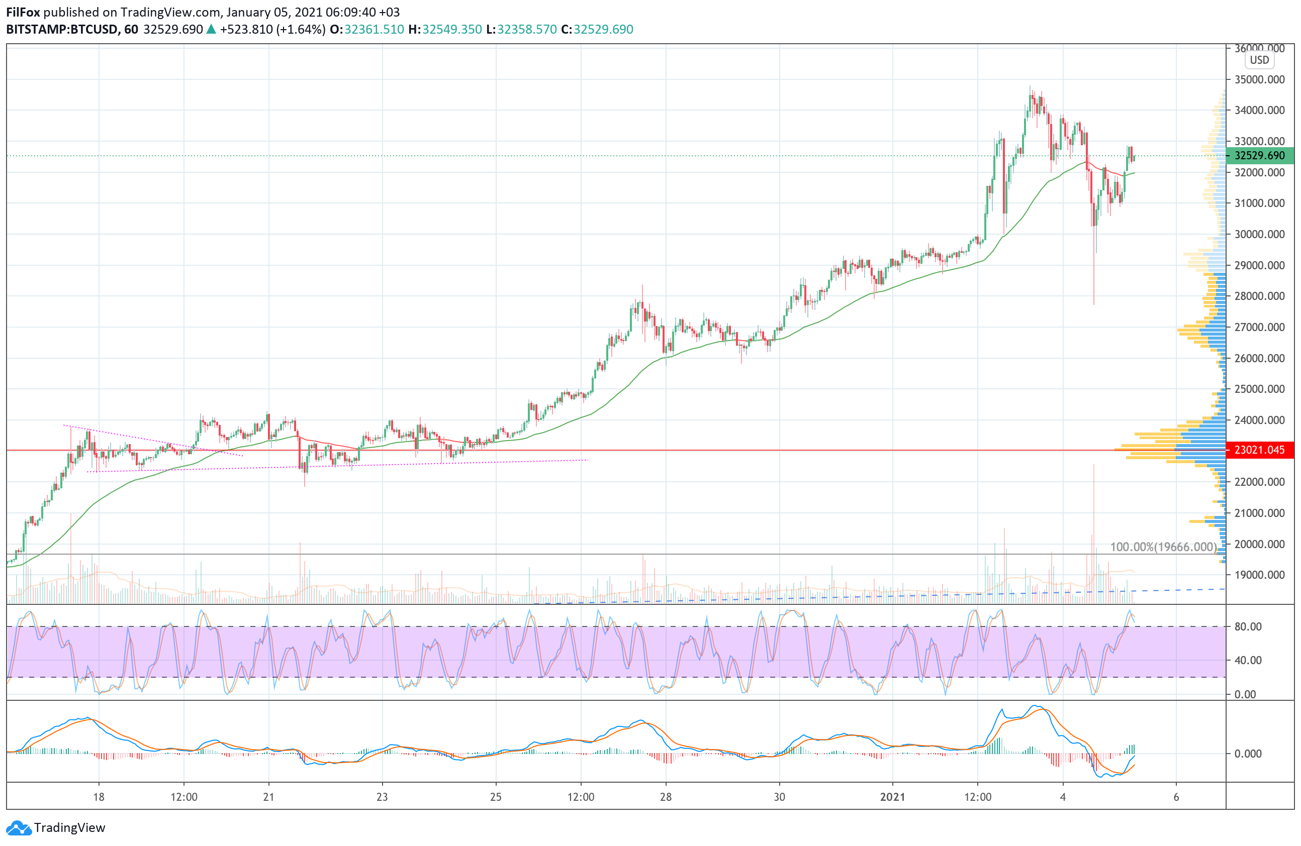 Сегодня ночью покупатели пытались продолжить восстановление цены в зону максимума. Если скользящая средняя EMA55 сможет оказать цене BTC поддержку, то рост продолжится в область 36000.00 USD.