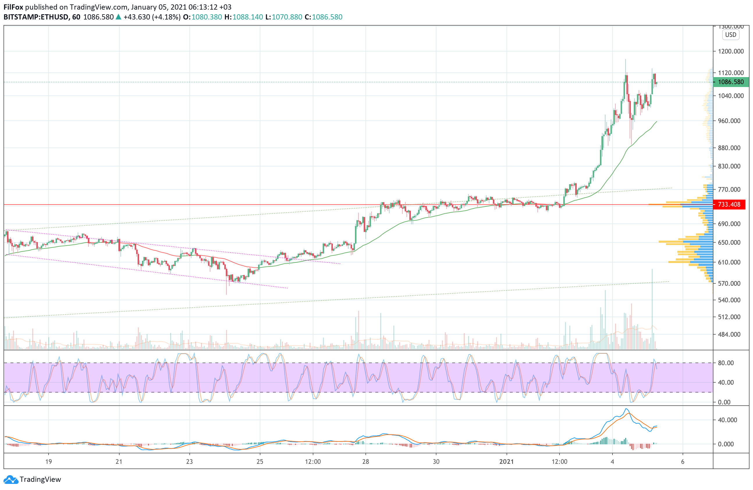 Резкий медвежий импульс остановил динамичный рост и заставил пару протестировать часовую EMA55. От этой скользящей средней цена эфира отскочила в район отметки 1000.00 USD, но продолжить былой динамичный рост пока не получается.