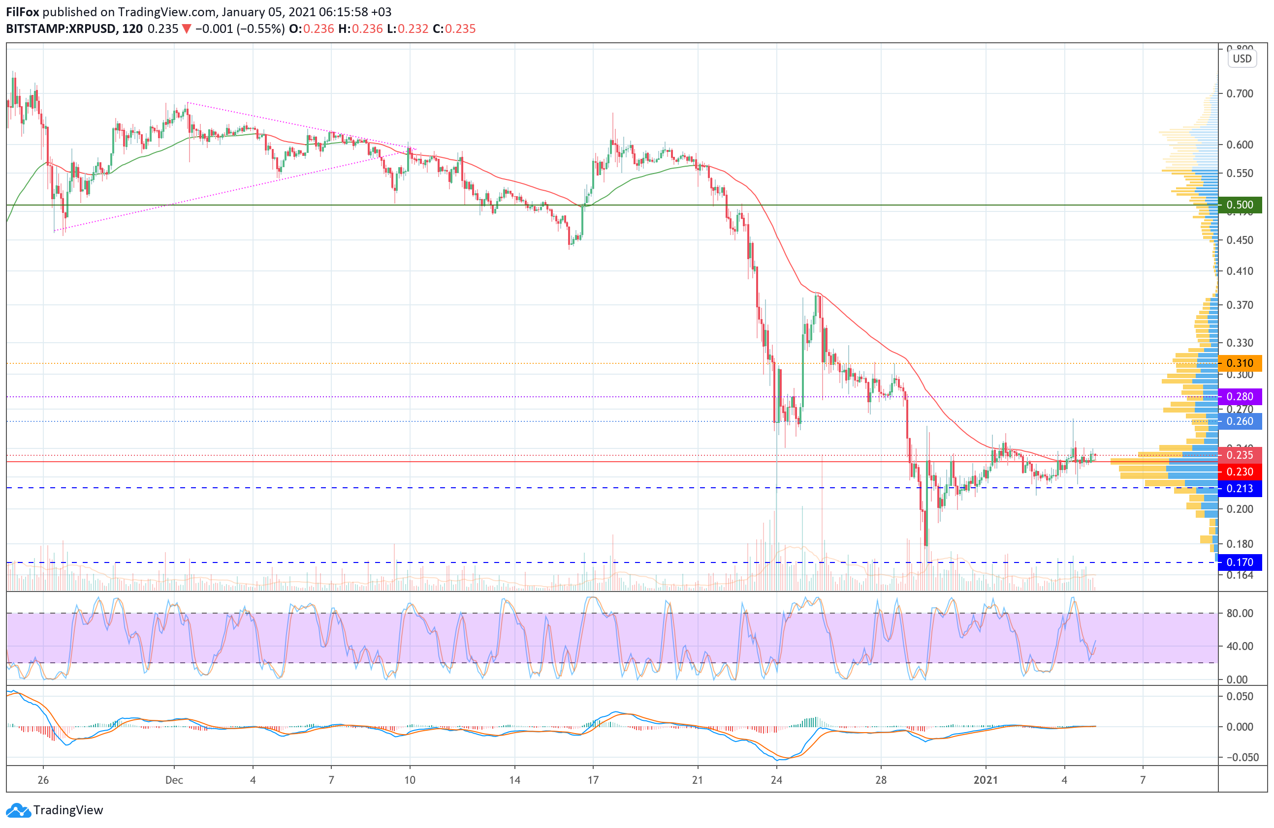 Однако, продолжить восстановление не удалось и до завершения дня пара вернулась в узкий боковой коридор на уровне средних цен. Если индикаторная линия POC (0.230 USD) не удержит пару в консолидации, то снижение может продолжиться к поддержке 0.213 USD, а во второй половине недели достигнет нижней границы синего коридора 0.170 USD.