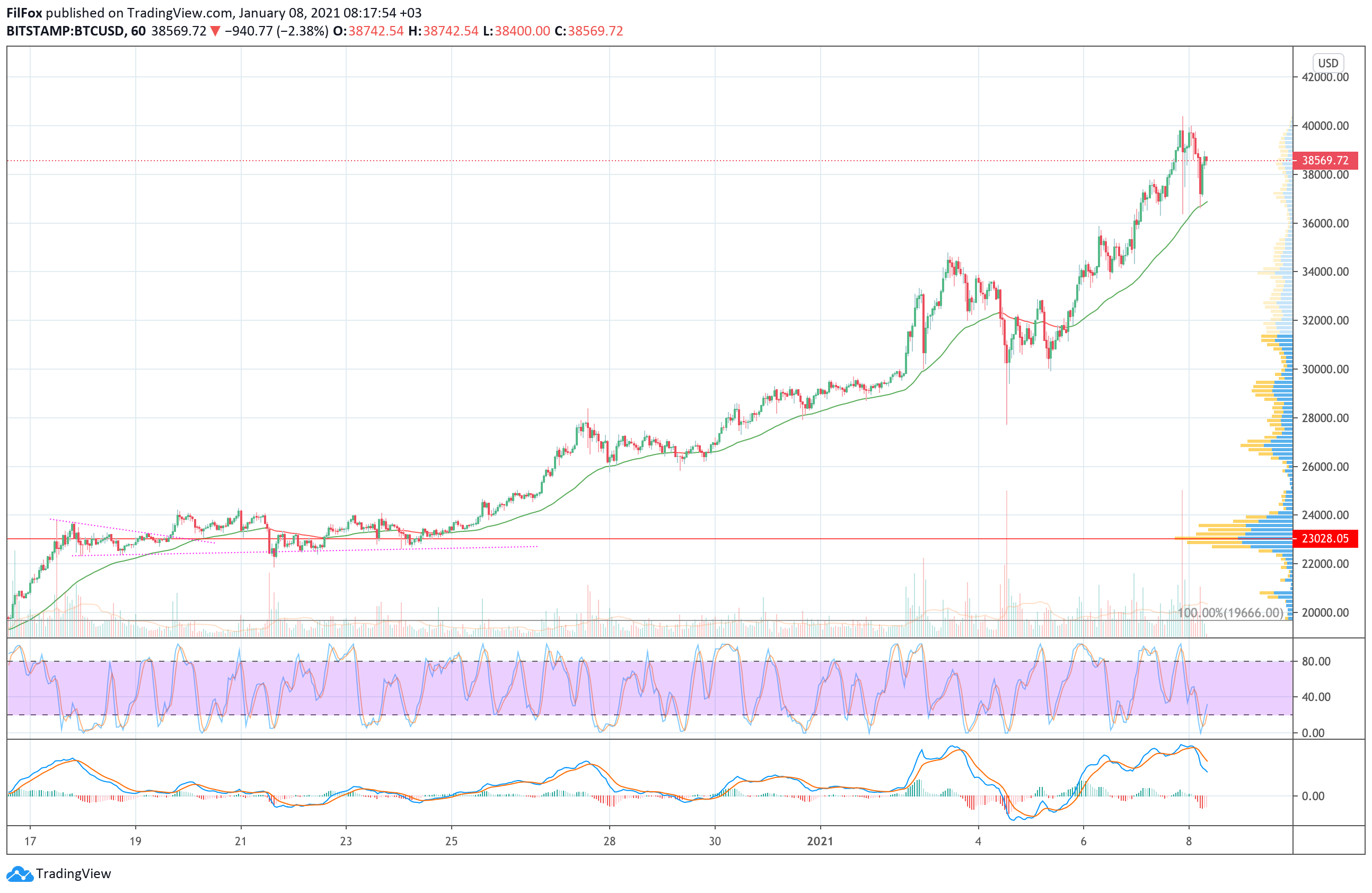 Вчера утром коррекция цены BTC проходила на малых объёмах, и была в пределах поддержки 36300.00 USD. Днём быки возобновили забег и к вечеру пробили уровень 40000.00 USD, установив исторический максимум в районе отметки 40400.00 USD.
