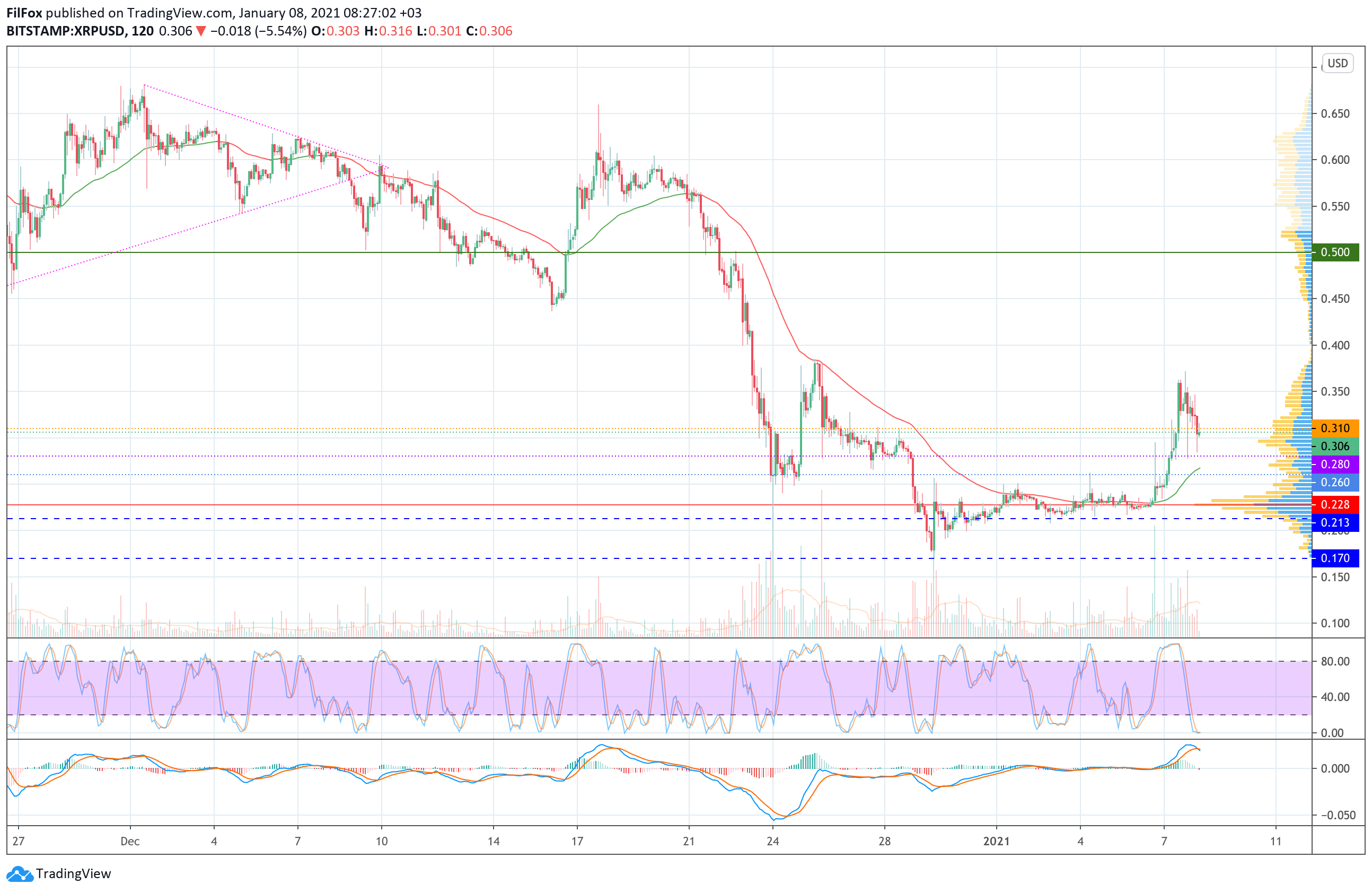 Вчера, в первой половине дня, покупатели закрепились над уровнем 0.280 USD и продолжили рост к уровню 0.400 USD. Однако, до завершения дня цена XRP так и не смогла протестировать эту целевую отметку, установив дневной максимум в точке 0.372 USD.
