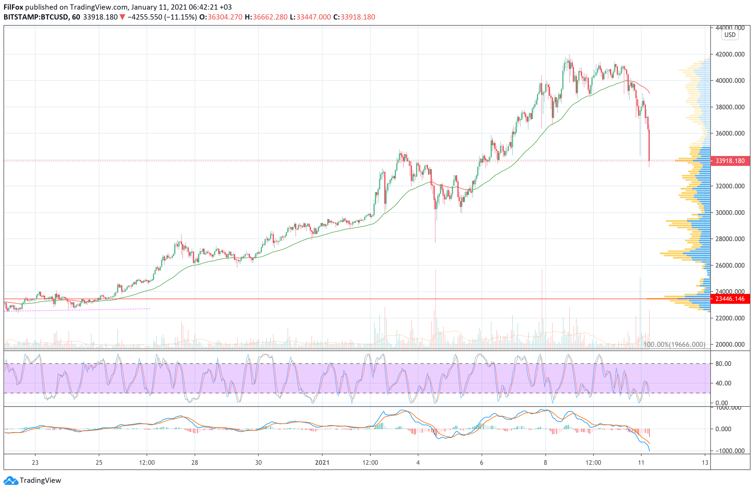 В конце минувшей недели сложность майнинга BTC выросла на 11%, и это привело к всплескам продаж. В воскресенье медведи продавили скользящую среднюю EMA55, а сегодня утром протестировали уровень 34000.00 USD.