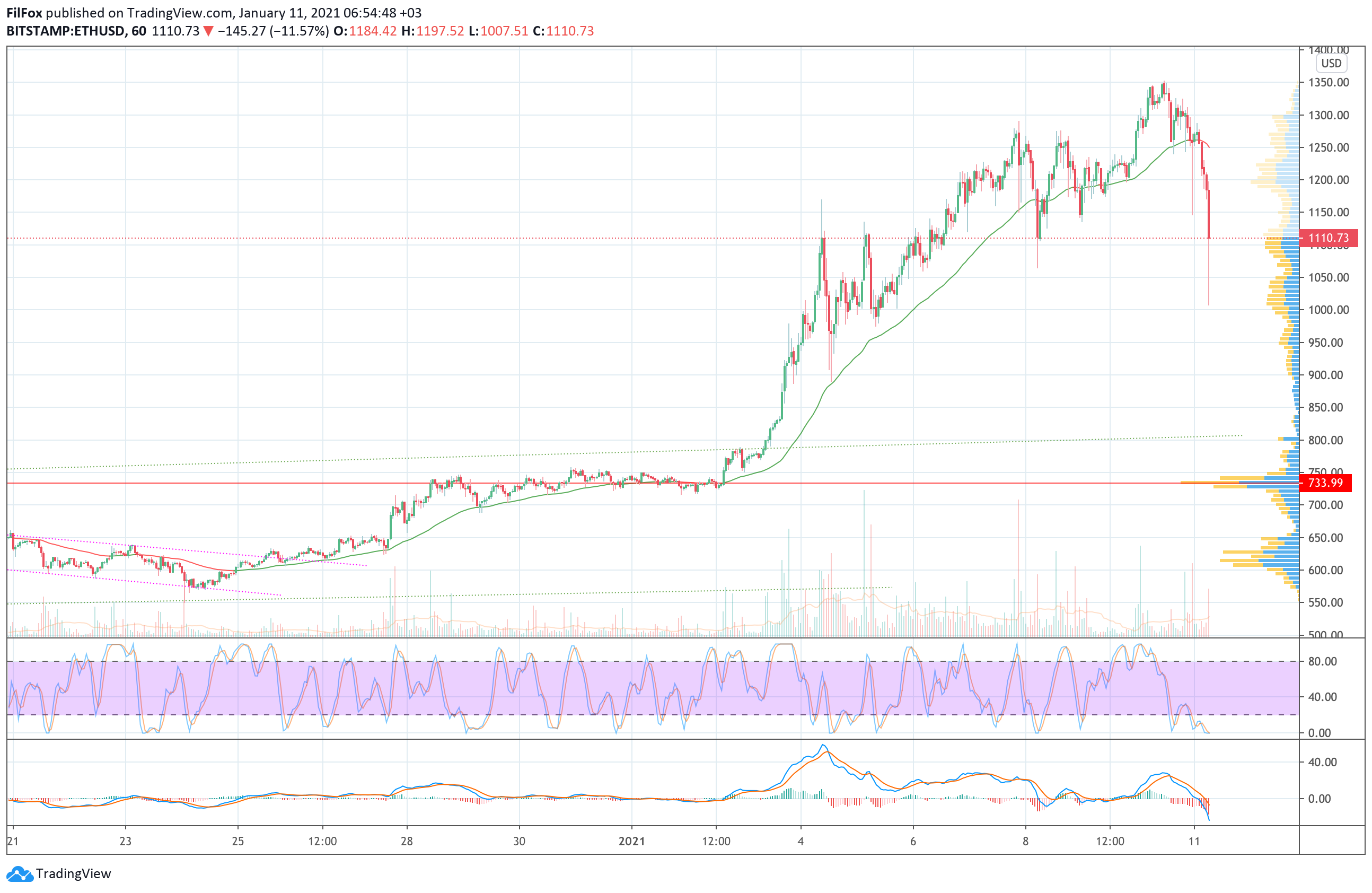 Во второй половине дня цена эфира вернулась к часовой скользящей средней EMA55, а сегодня ночью медведи продавили эту поддержку и на утро были близки к те-тесту психологической отметки 1000.00 USD.