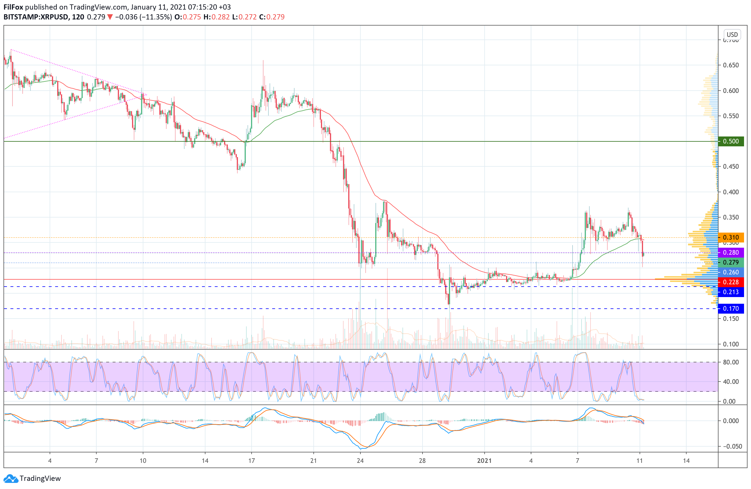 На сегодняшнее утро цена отскочила и в течение дня покупатели попытаются вернуть пару в боковой коридор $0.280 - $0.310. Однако, если медведи усилят натиск, то цена Ripple просядет к линии POC (0.228 USD).