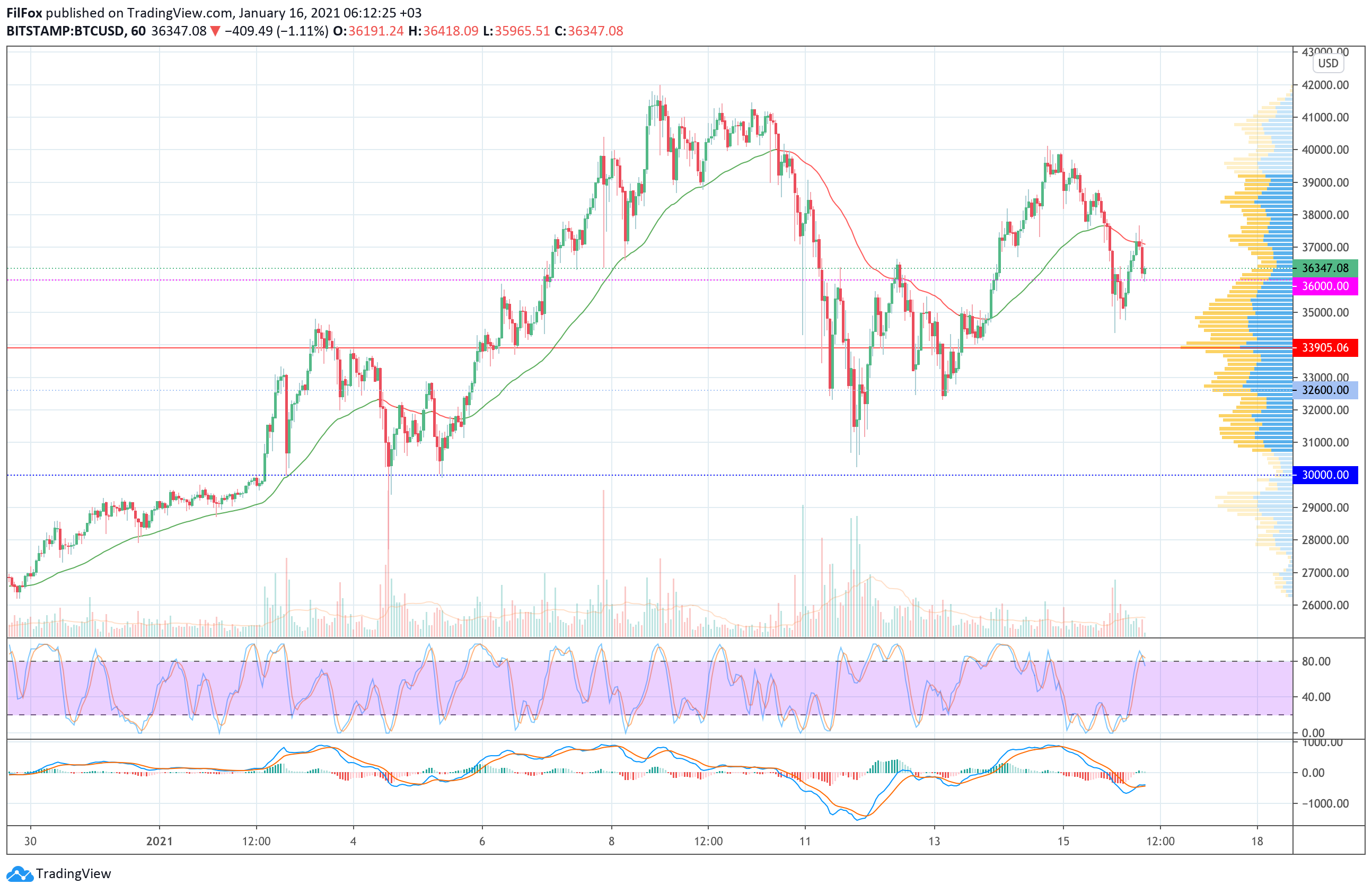 Вчера давление медведей не позволило цене BTC закрепиться выше среднего уровня. Сегодня утром цена тестирует поддержку на уровне 36000.00 USD.