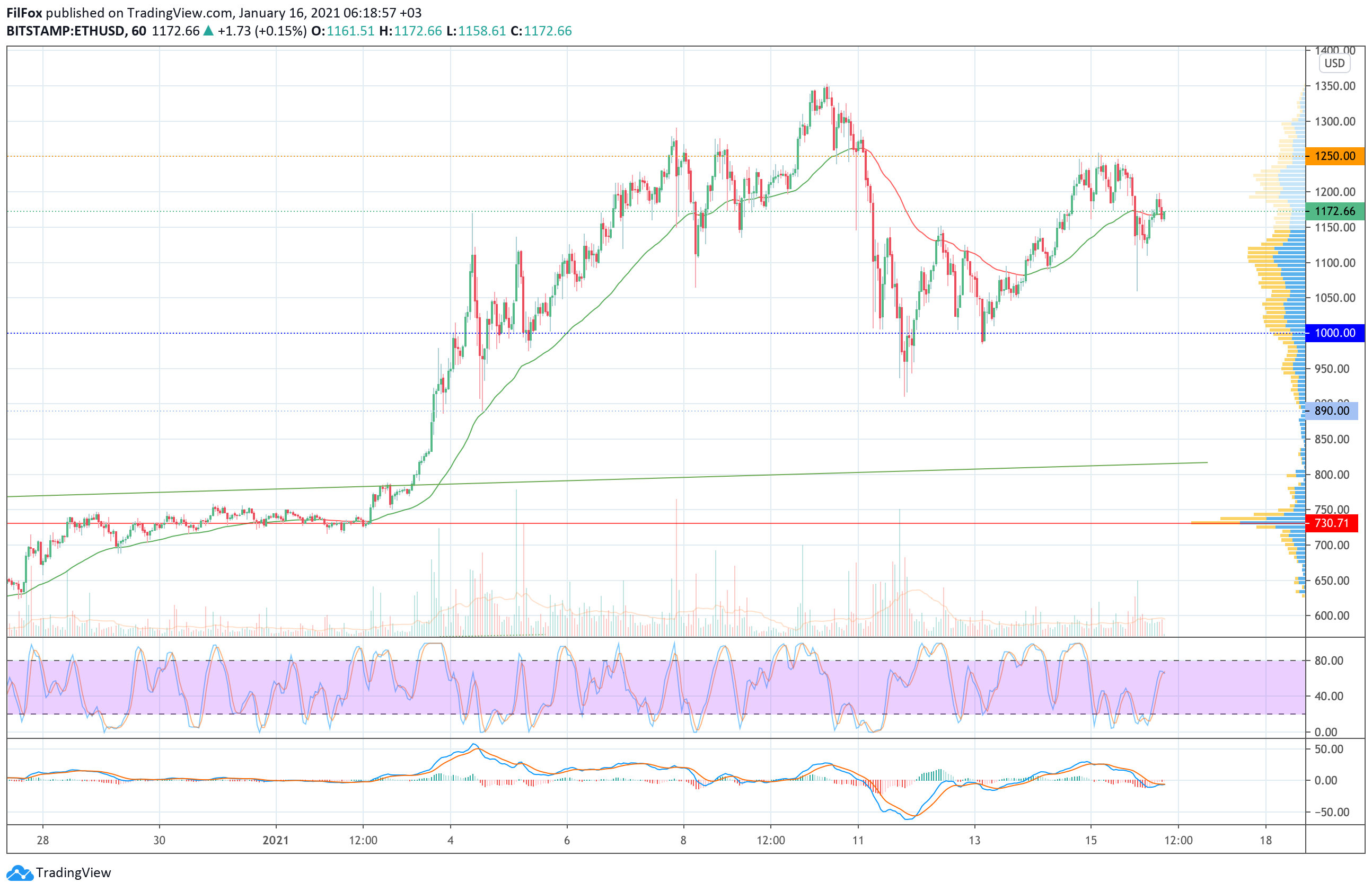 Вчерашний медвежий импульс установил локальный минимум в районе отметки 1060.00 USD, но к завершению дня пара полностью восстановилась в область средних цен. Более того, сегодня утром, цена эфира пытается закрепиться выше среднего уровня, используя скользящую среднюю EMA55 как поддержку.