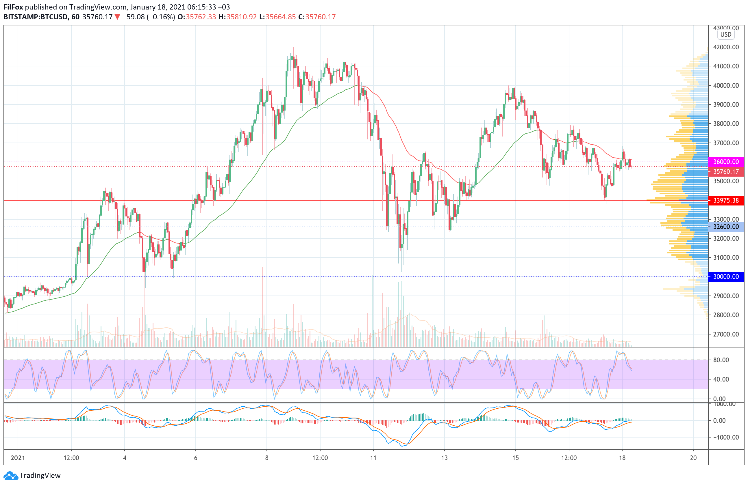 Сегодня попытки закрепиться над уровнем средних цен повторятся, но если пробить скользящую среднюю не удасться, то снижение пары продолжится ниже линии POC, к поддержке 32600.00 USD.