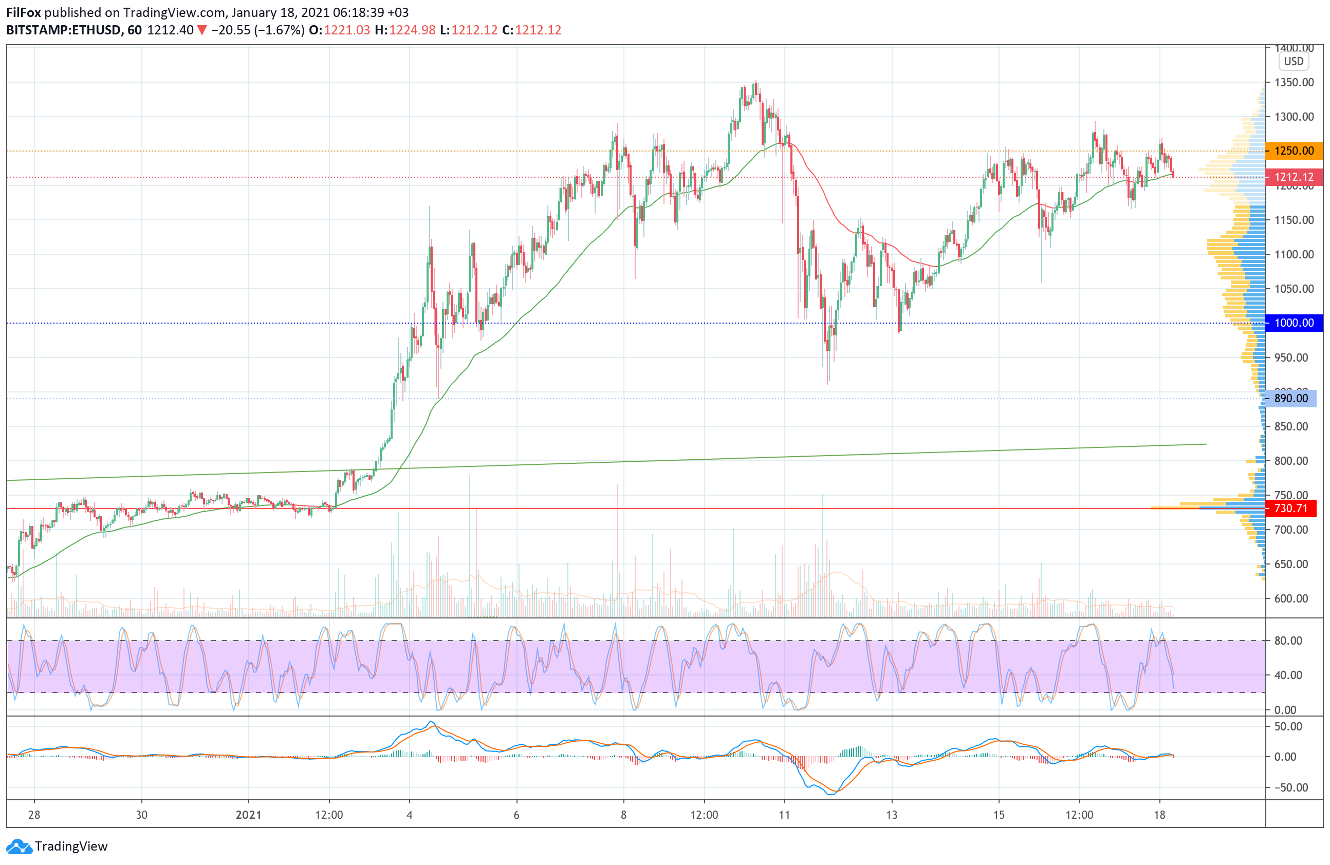 В прошедшую субботу покупатели смогли проколоть сопротивление на уровне 1250.00 USD, но продолжить восстановление до завершения недели так и не получилось. В воскресенье продавцы оттеснили пару ниже уровня средних цен и до конца дня покупателям так и не удалось восстановить цену ETH на прежний уровень.