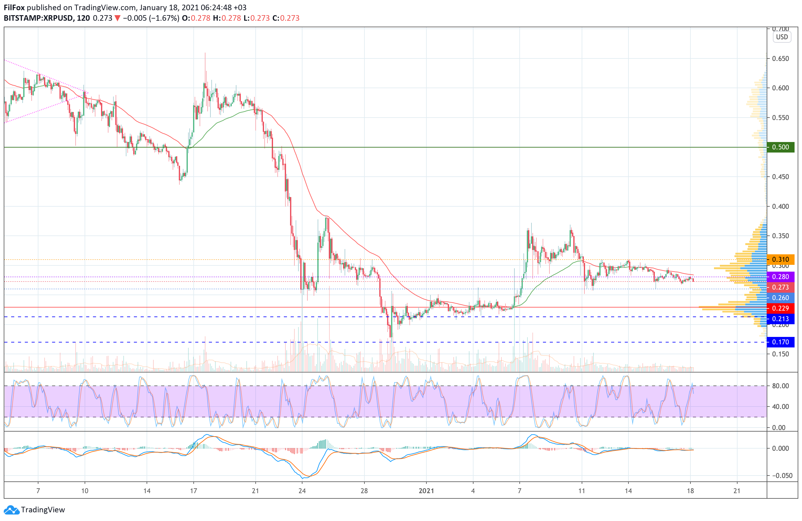 В субботу цена XRP пыталась закрепиться в боковом коридоре $0.280 - $0.310, но двухчасовая скользящая средняя развернула пару на снижение и нижняя граница коридора не смогла остановить откат в район отметки 0.270 USD.