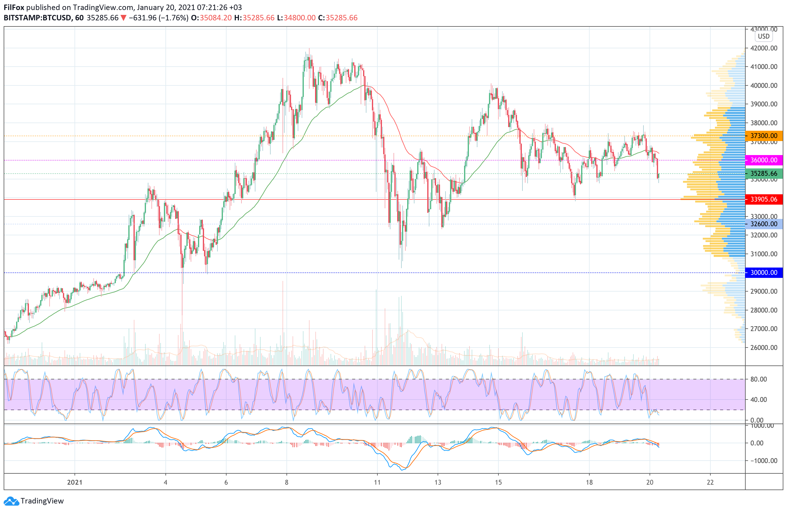 За минувшую ночь пара откатилась чуть ниже уровня средних цен и пыталась удержаться в области 36000.00 USD, но медведи уже успели продавить этот уровень поддержки, и сегодня снижение продолжится в район отметки 34000.00 USD, где проходит индикаторная линия Point Of Control. Полагаем, что в этой зоне снижение может замедлиться.