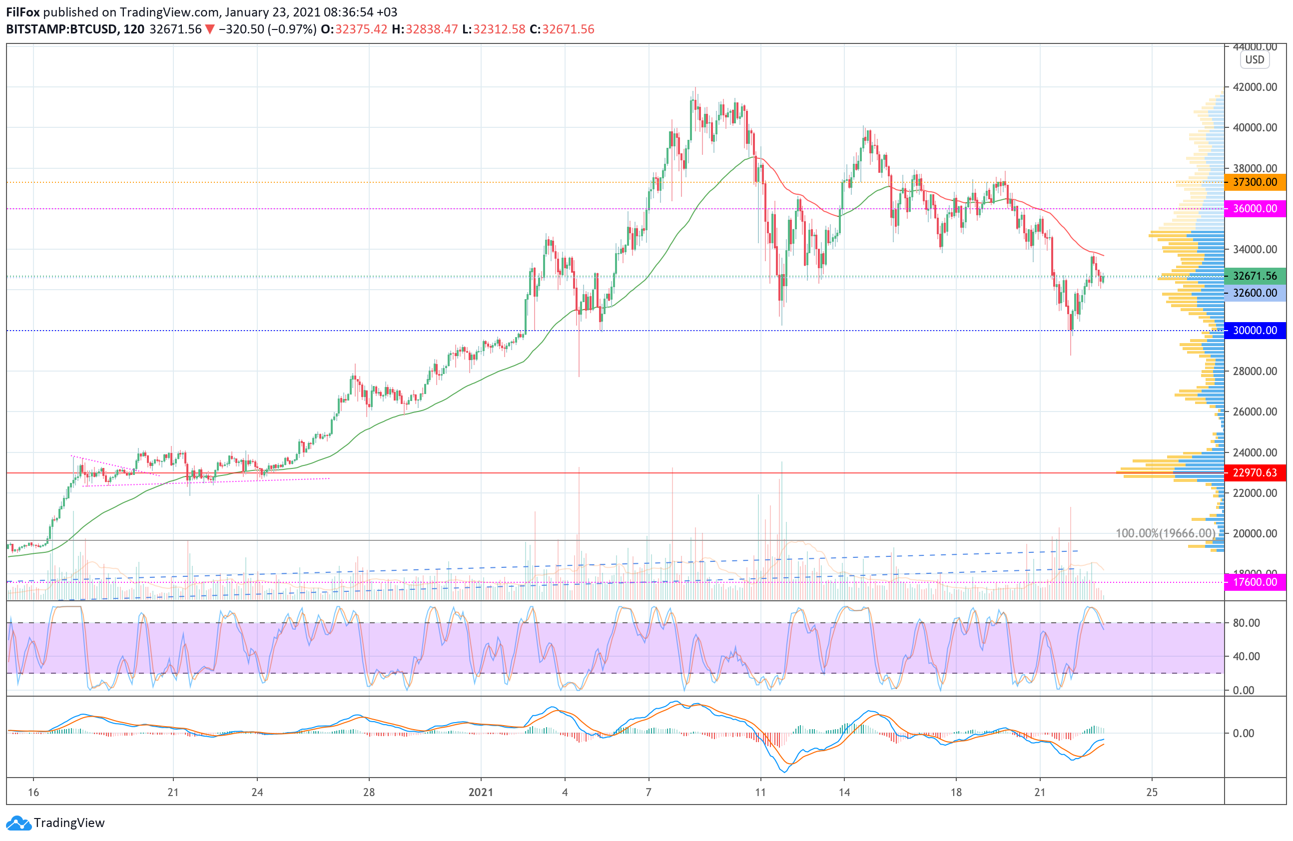 Вчера утром объёмы продаж сократились, и давление со стороны медведей ослабло. Покупатели на средних объёмах начали восстанавливать цену BTC, так что уже во второй половине дня пара достигла сопротивления 32600.00 USD.