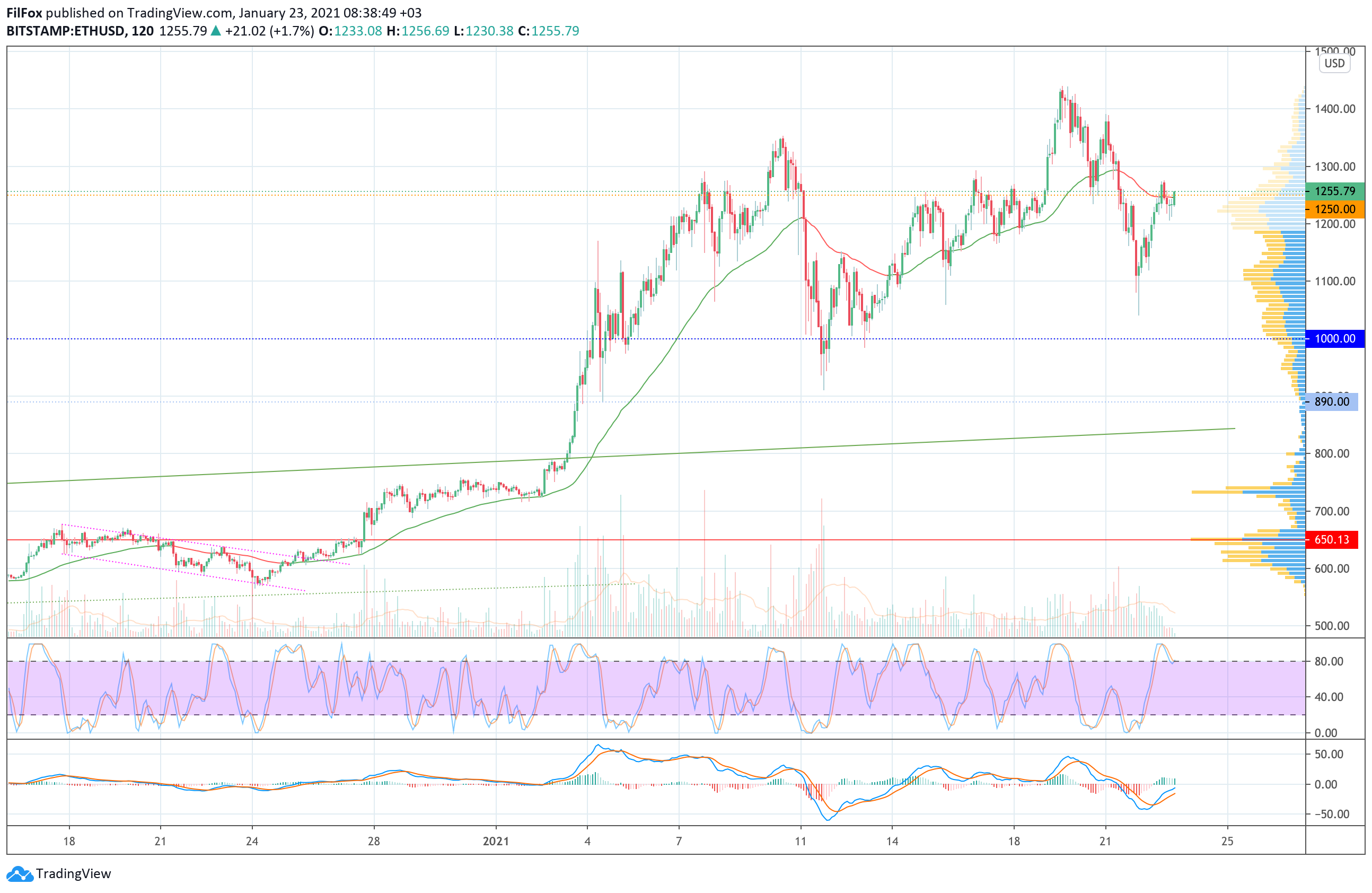 Несмотря на пессимистичные прогнозы, в пятницу цене Ethereum удалось восстановиться к сопротивлению 1250.00 USD. Восстановление проходило на сокращающихся объёмах, поэтому рост приостановился в области средних цен.