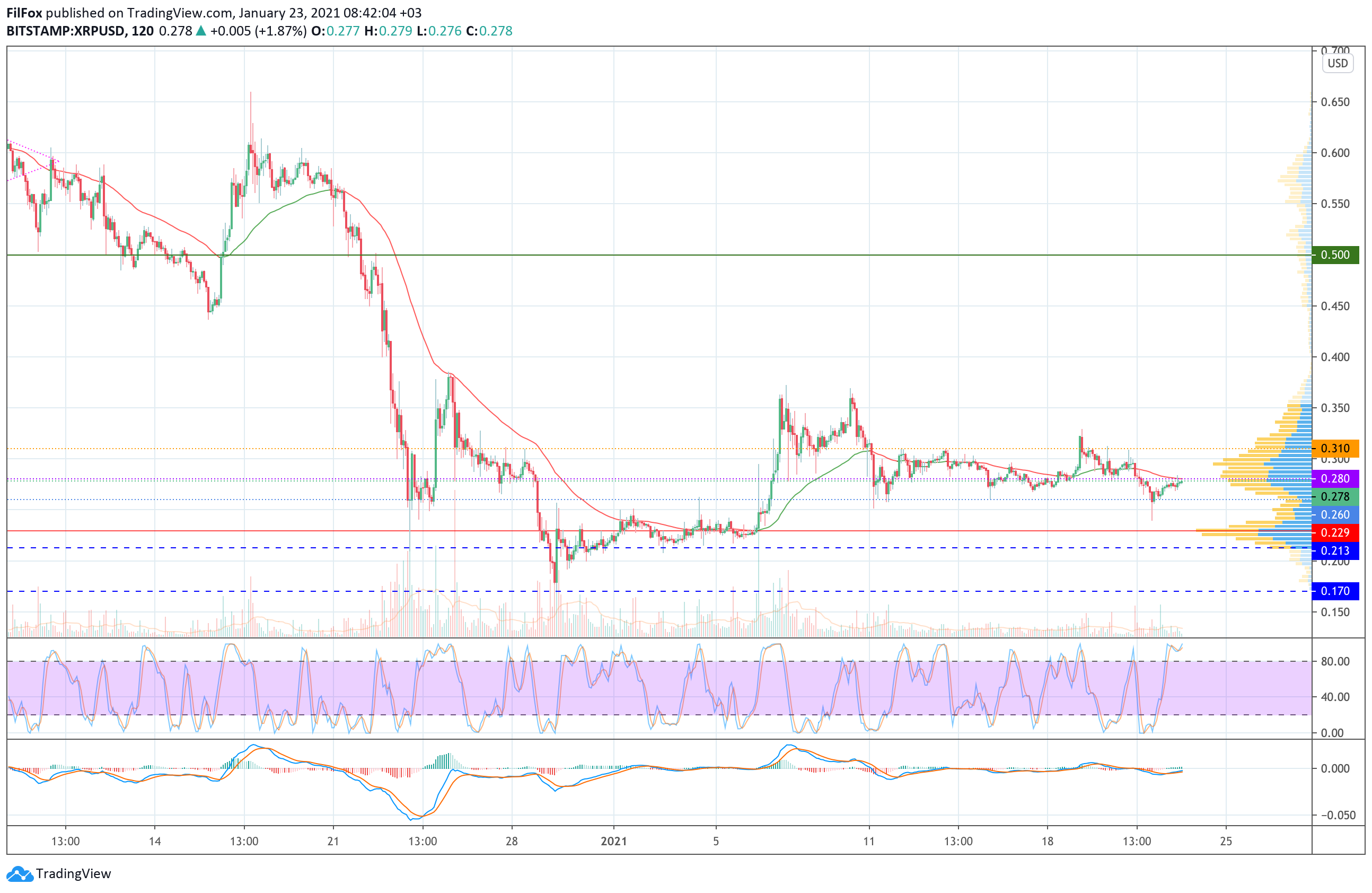 На выходных покупатели продолжат попытки восстановить пару выше уровня средних цен. Если они преодолеют сопротивление двухчасовой EMA55, то восстановление продолжится к верхней границе бокового коридора 0.310 USD. В противном случае - атака медведей приведёт к падению цены ниже линии POC (0.229 USD).