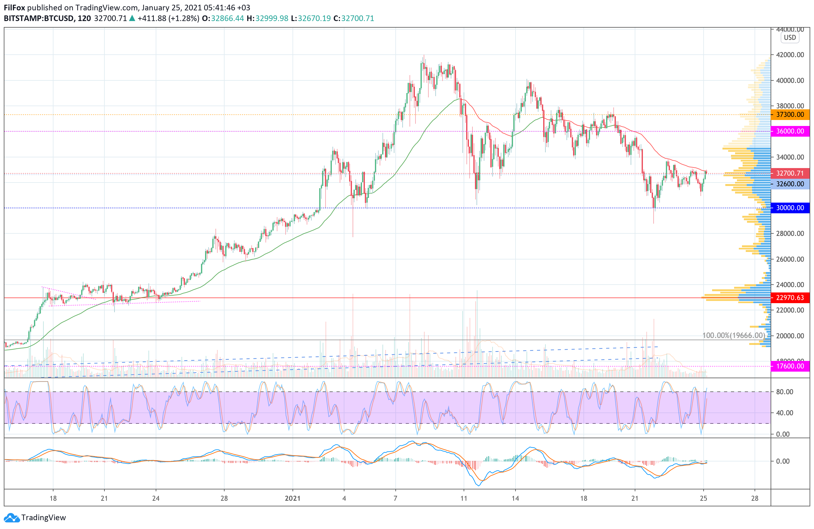 В субботу торги по Bitcoin проходили на низких объёмах, и пара зависла в боковом диапазоне в районе поддержки 32600.00 USD.