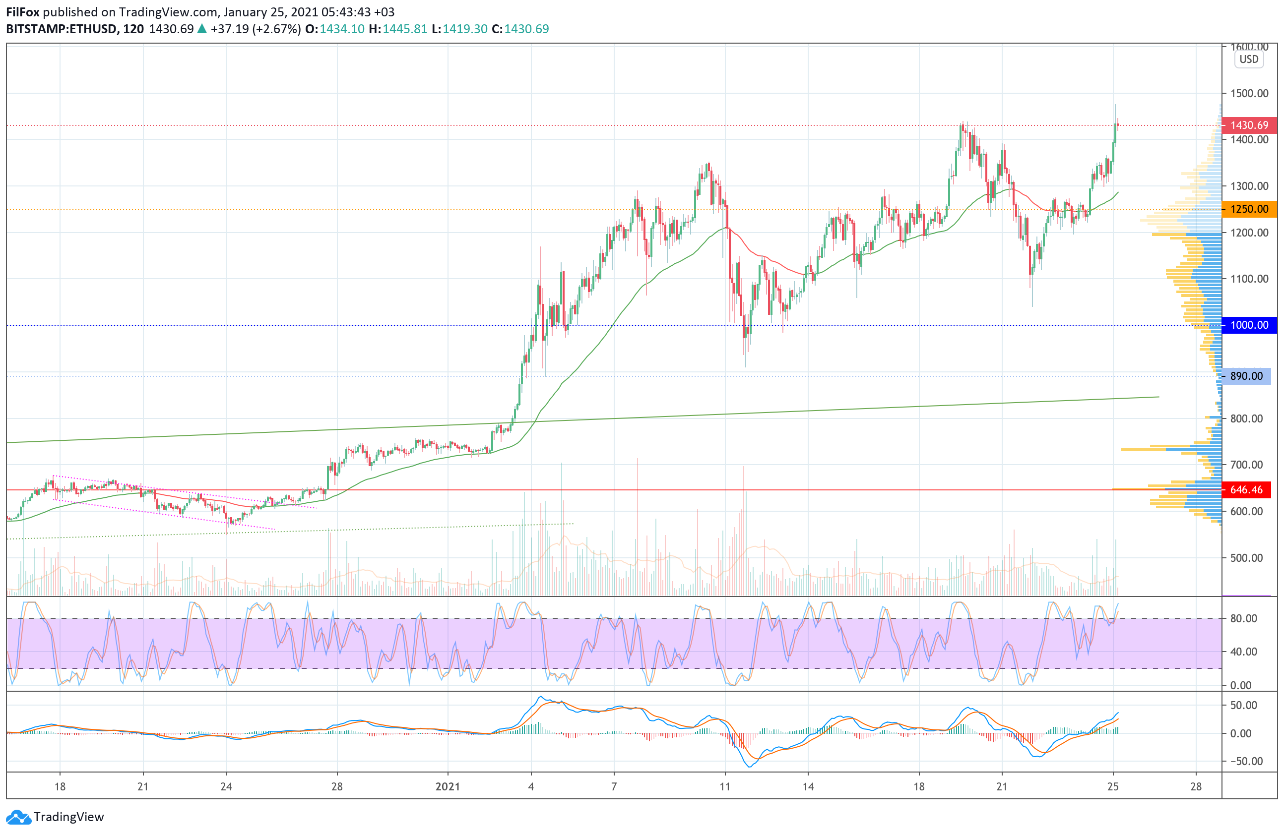 В минувшую субботу цена Ethereum консолидировалась в области средних цен. В ночь на воскресенье покупателям удалось сформировать бычий импульс, который восстановил цену эфира в район сопротивления 1350.00 USD. Сегодня ночью быки прорвали этот уровень, обновив исторический максимум в точке 1476.06 USD.