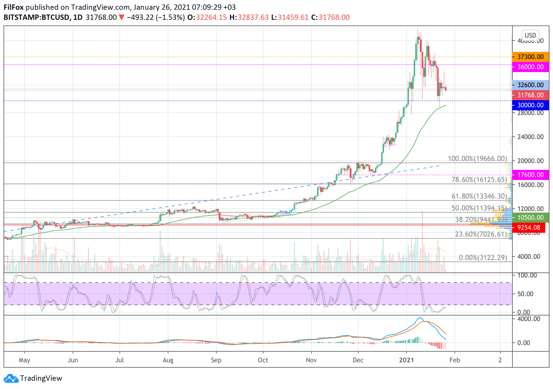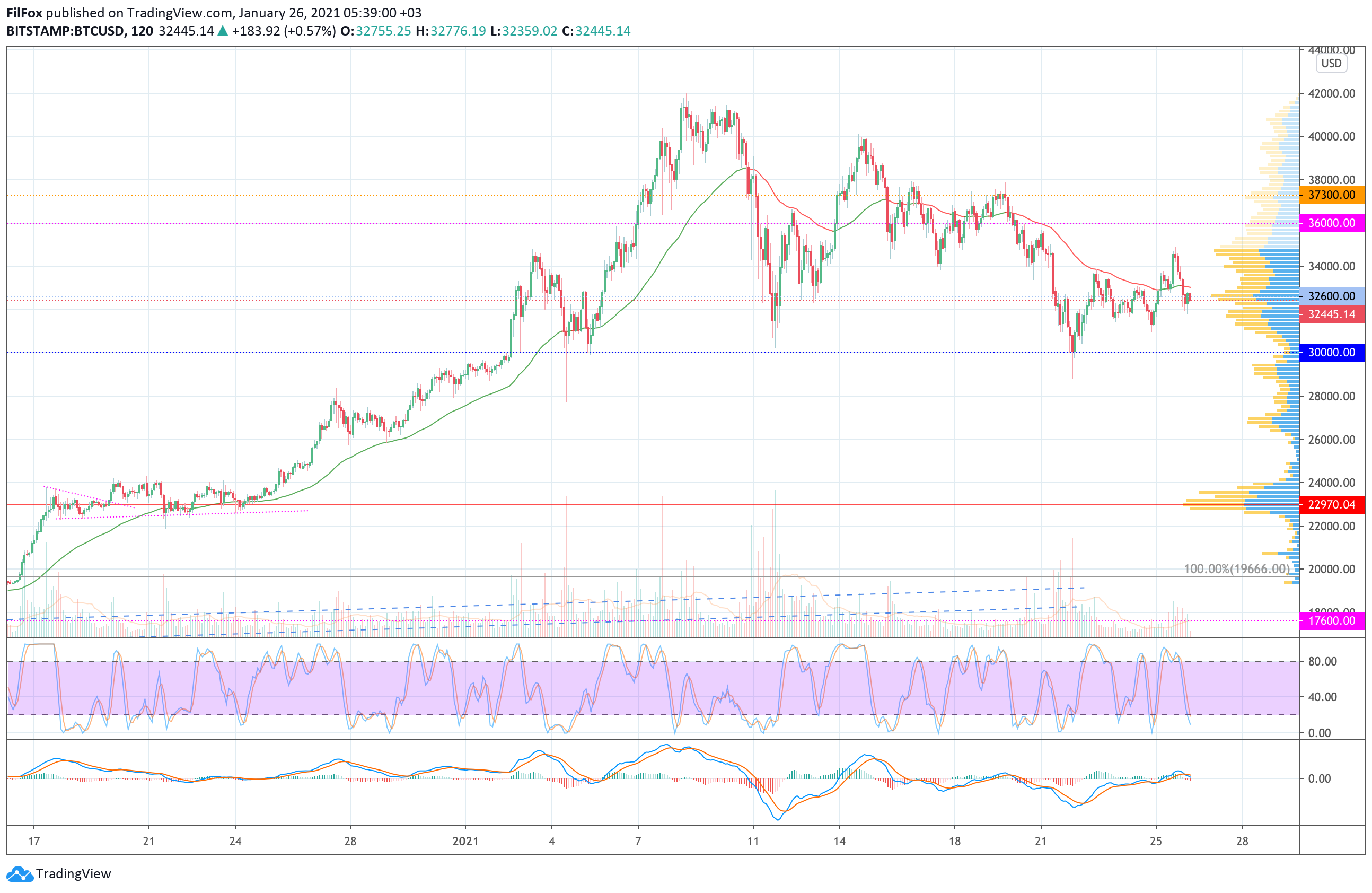 Однако, до конца дня пара не смогла закрепиться выше двухчасовой EMA55 и вернулась к поддержке 32600.00 USD. До сегодняшнего утра пара оставалась в узкой консолидации на уровне этой поддержки.