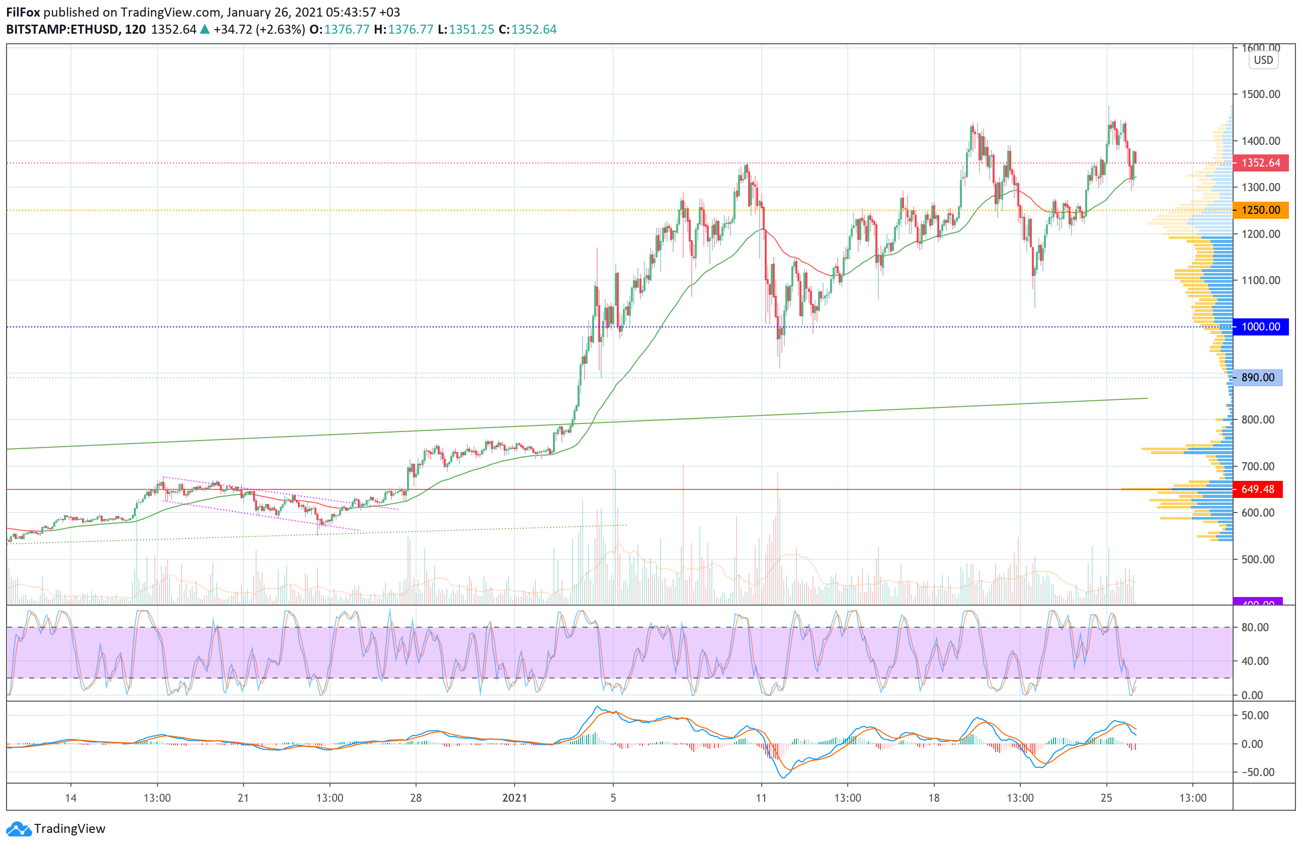 Цена Ethereum вчера долго удерживалась выше отметки 1400.00 USD, но в завершении дня медведи продавили эту поддержку и откатили пару в область средних цен (1300.00 USD).